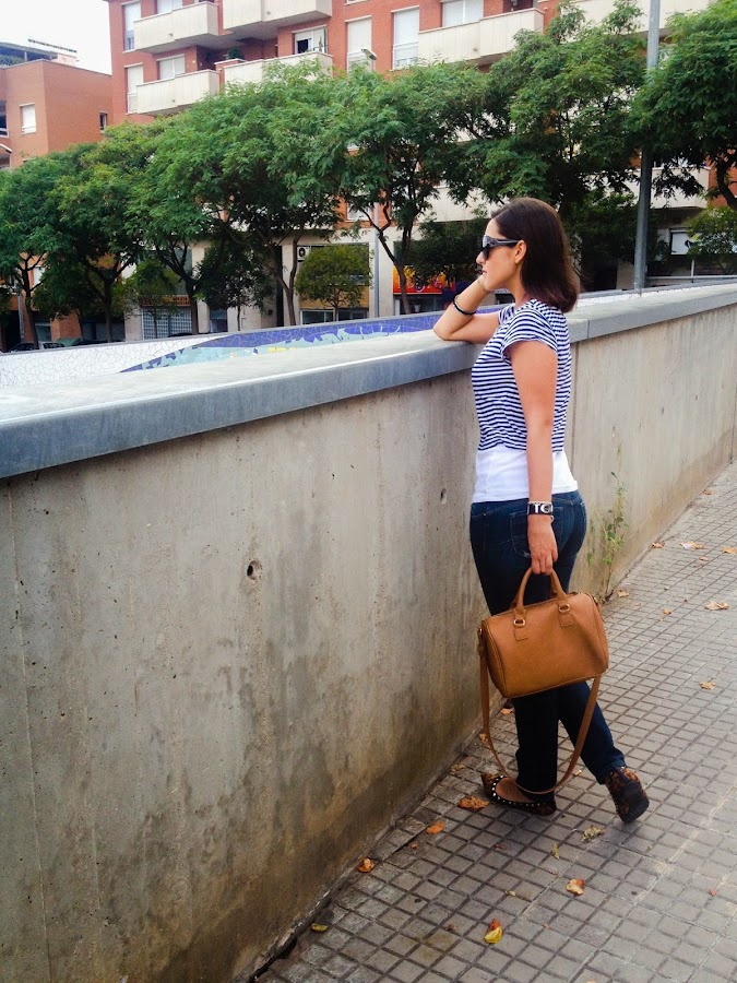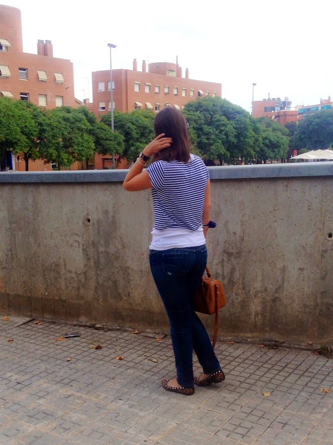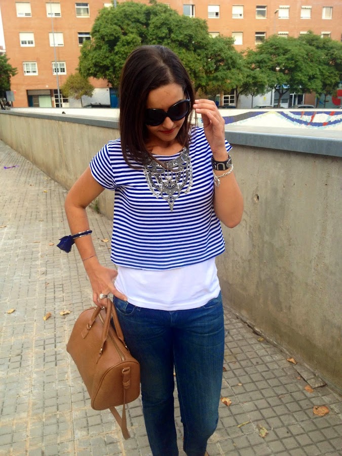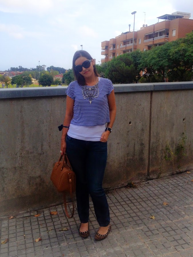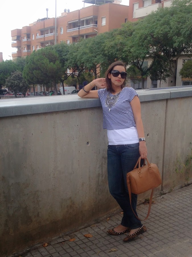 Buenas noches amores! Hoy os muestro el look que lleve el pasado viernes a trabajar. Los viernes normalmente suelo llevar tejanos, ya que el resto de la semana voy con pantalones de vestir. Combine mis tejanos con un crop top de rayas marineras, pero como era un look para ir a trabajar me puse un camiseta de tirantes debajo. Esta es una buena opción para llevar nuestros crops tops, ahora que no hace tanta calor y para poderlos llevar en más ocasiones. Para completar el look, mi inseparable collar de Primark y mis manoletinas de leopardo.