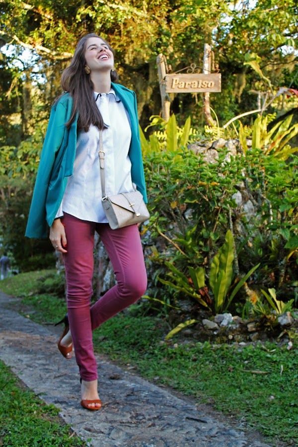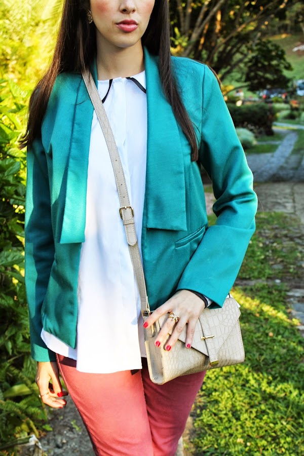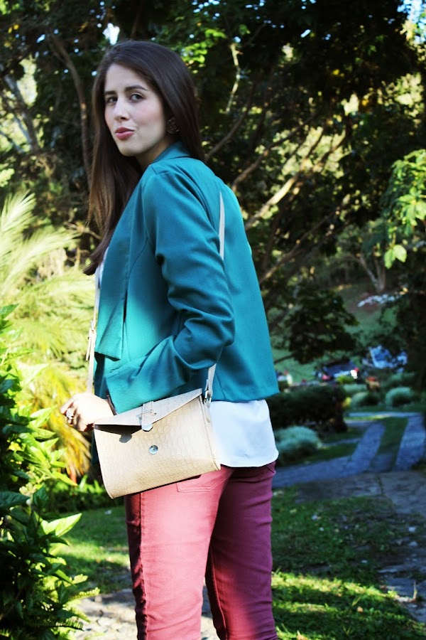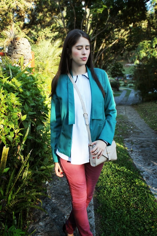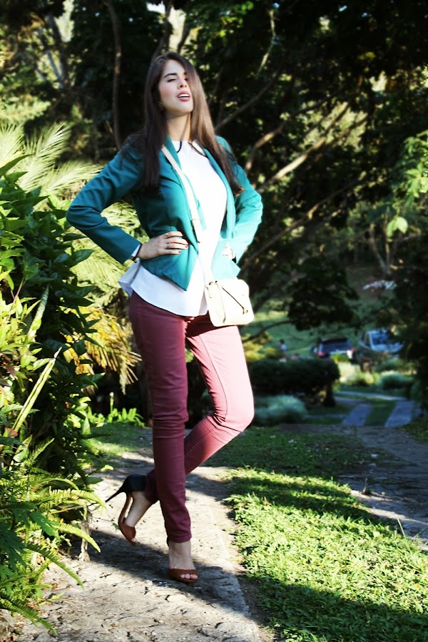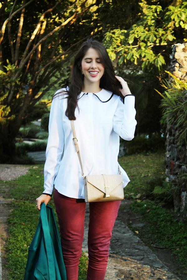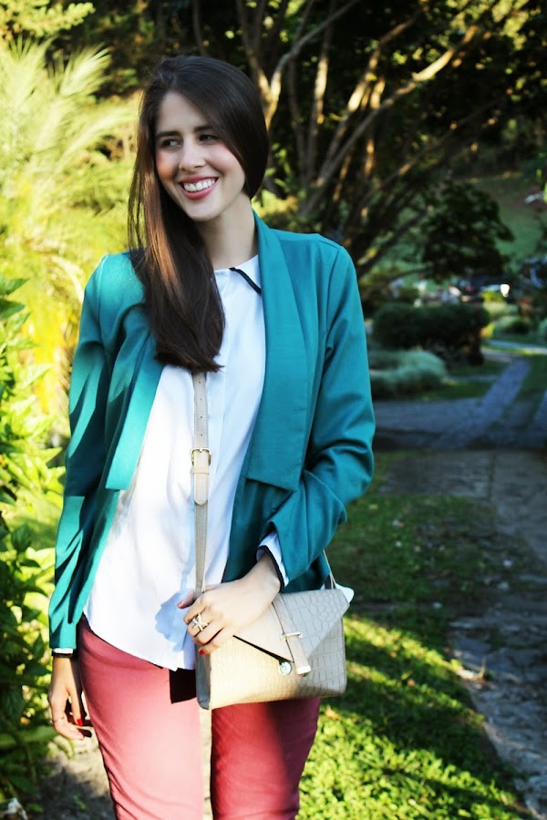 La combinación del blazer Aishop verde esmeralda y el pantalón Levi´s color vino es la base de todo el look, son colores que contrastan muy bien entre sí pero no podemos volvernos locas por eso mismo le saque provecho a esta hermosa camisa de la diseñadora Venezolana Sandra Pargas que es blanca pero tiene sus toques en negro y no es la típica camisa blanca que todas tenemos, agregue tacones en bicolor (marrón y negro) de soy garota, un bolso crema y accesorios en dorado.