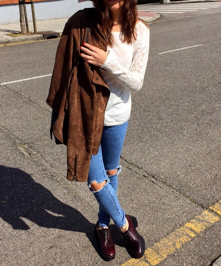 Con la llegada del buen tiempo lo primero que he sacado del fondo de mi armario han sido todos los pantalones rotos que tengo, me encantan pero soy tan friolera que en invierno los había dado por perdidos. En el look de las fotos llevo unos de mis favoritos, ya os los había enseñado en otro post hace un tiempo aquí. Los combine con unos blucher (estilo masculino) tengo que decir que me costo pillarle el punto a este tipo de zapatos, pero una vez que me animé fue todo rodado y ahora junto con pitillos mega ajustados son mi mejor opción. ¿Qué os parecen a vosotras?