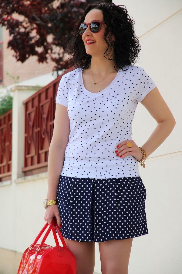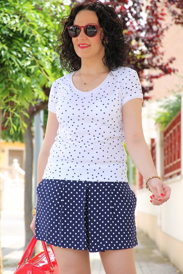 Este tiempo me va a volver loca, el domingo por la mañana un sol radiante con una temperatura buenísima que te permitía llevar ropa más liviana y por la tarde tormenta para luego quedarse un fresquito que te obligaba a llevar chaqueta. Así que el outfit que os enseño tan solo lo pude llevar hasta después de comer. Tenía muchas ganas de ponerme esta falda pantalón de topos con un look más veraniego, y por eso elegí esta camiseta de topos que lleva los mismos colores que la falda pantalón pero en orden contrario, el resultado de este combo de topos me encanta. En un principio pensé en el amarillo para los complementos, pero después de lo que estoy llevandolo últimamente opté por el rojo que siempre queda bien con esta gama de colores.