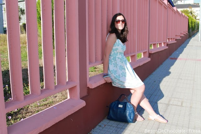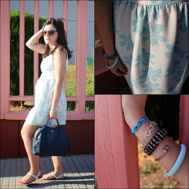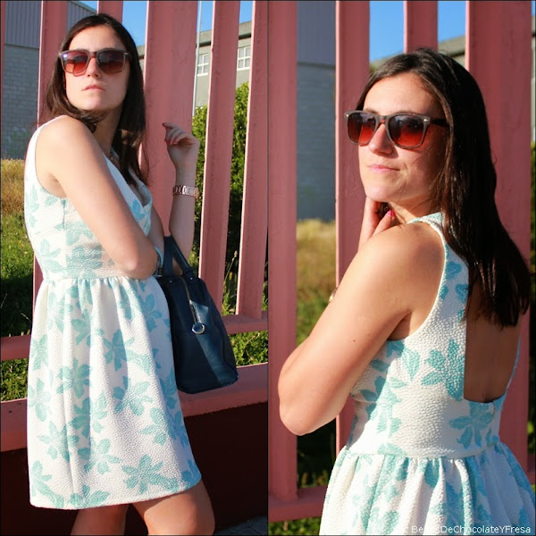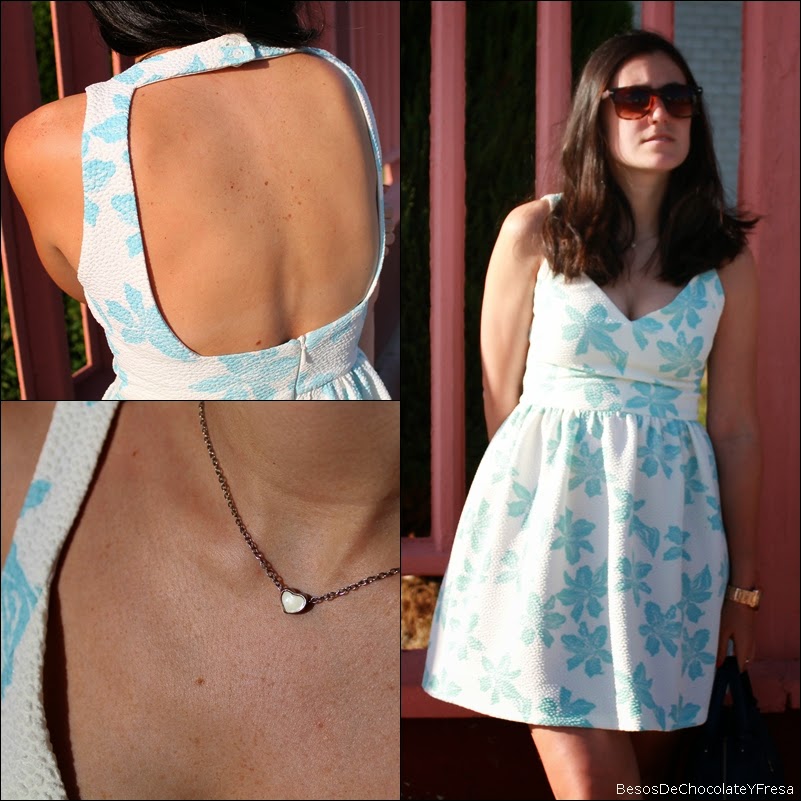 Today I bring you a look lady with this dress from Zara in baby blue and white, with cleavage peak and floral print. But the most surprising thing is super neckline in the back that makes it more special and super sexy. Combined it with skewers, necklace heart sandals, bracelets to game and bag in dark blue to give a bit of contrast and color.
