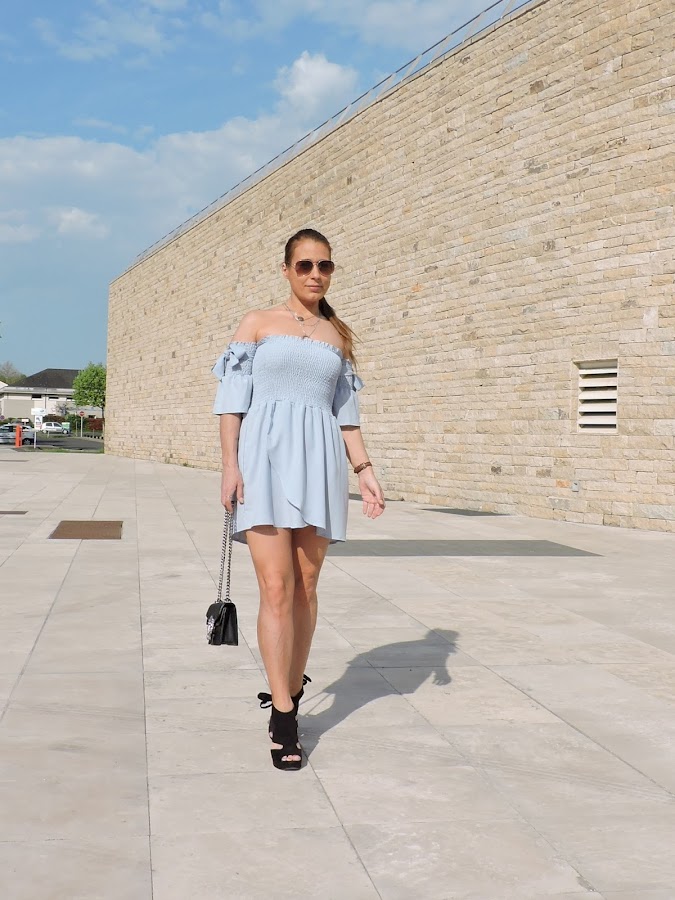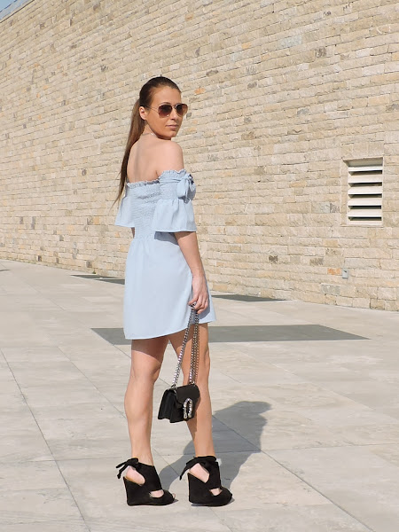 Es de Zaful me encanto el corte, soy fan de los vestido palabra de honor, el color y sobre todo los detalles en las mangas, tiene un tejido fluido, que es super cómodo y lo mejor de todo es que vale menos de 22 euros, el bolso también es de Zaful.