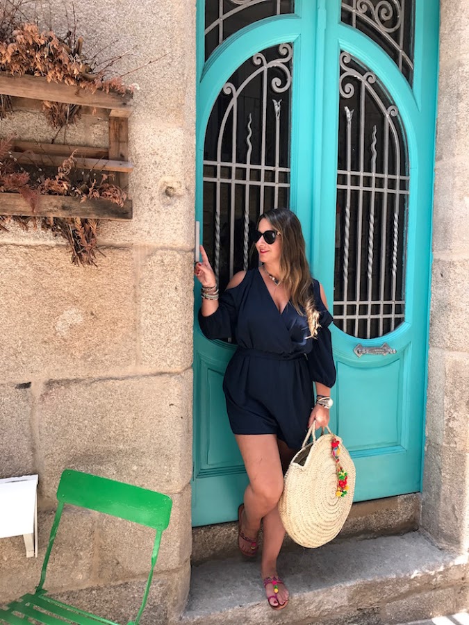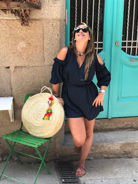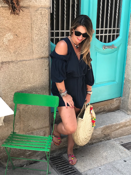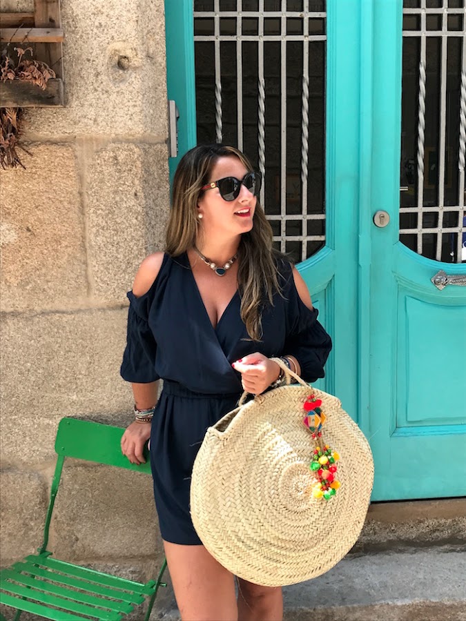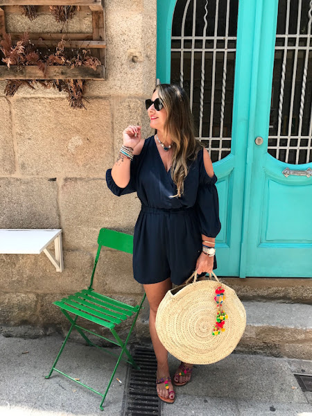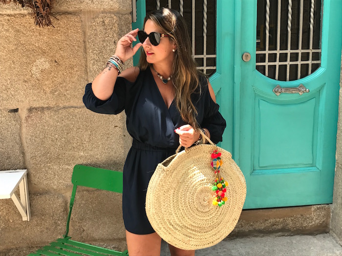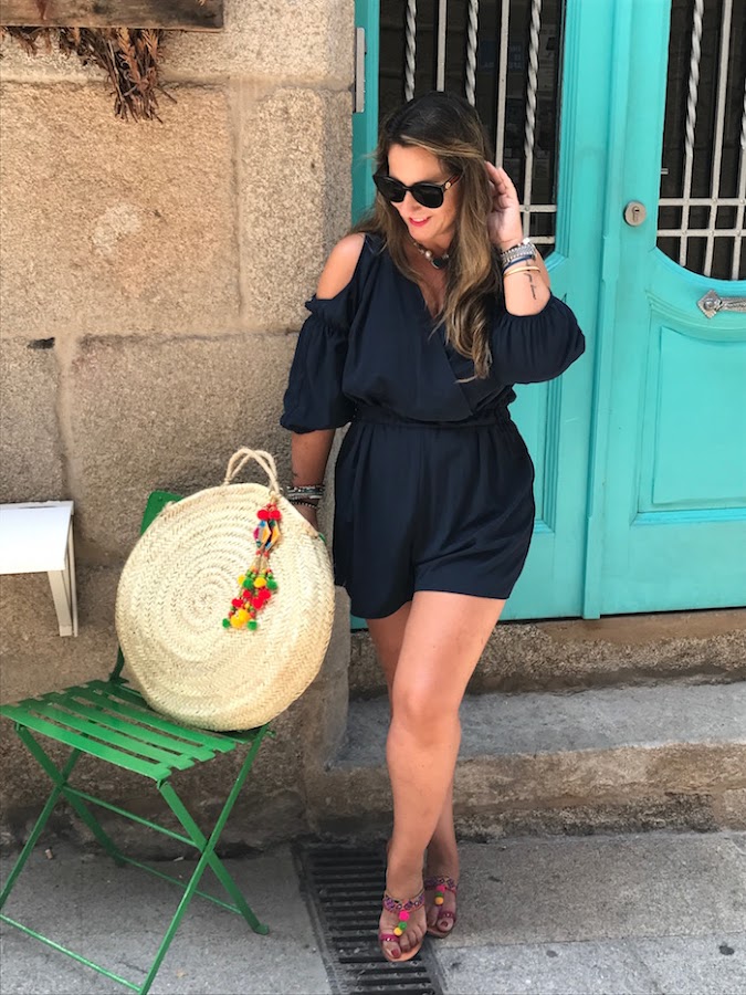 El look de hoy está formado por un mono en color azul con hombros al descubierto. Lo combiné con mis nuevas sandalias traídas de India y el cesto del verano, regalo de mi cumple y al que le puse unos llaveros como charm que también traje de mi viaje a India.