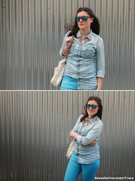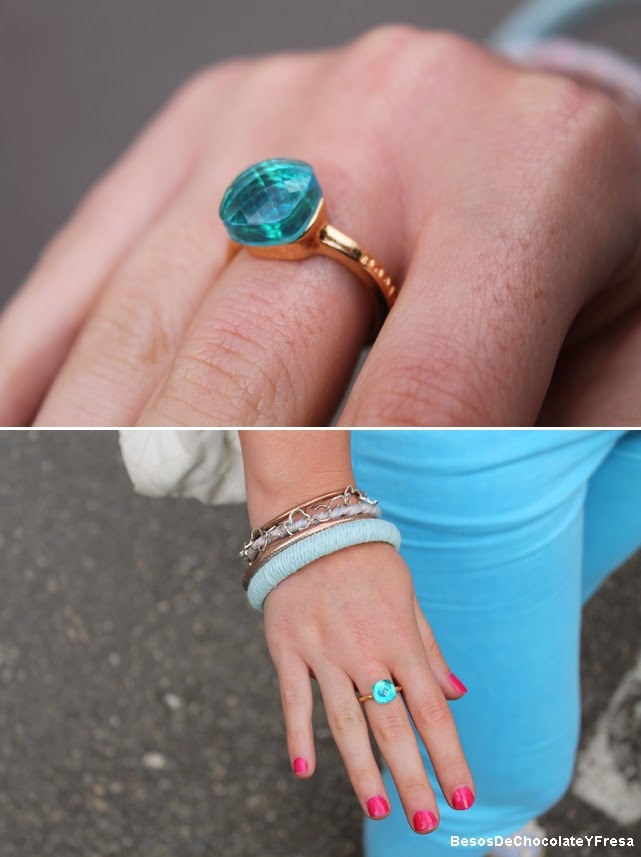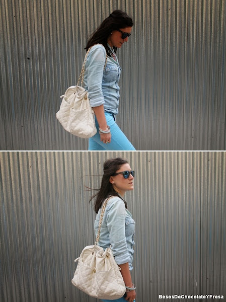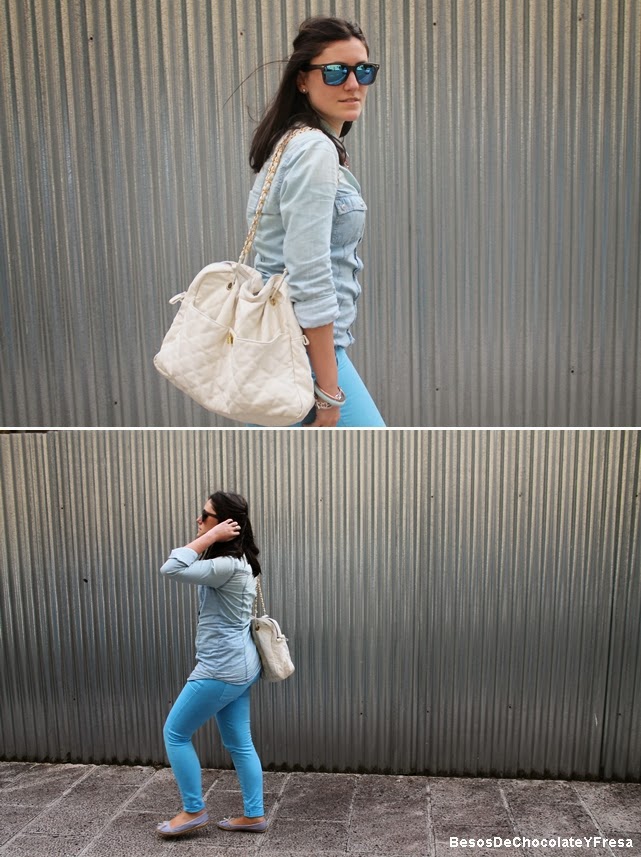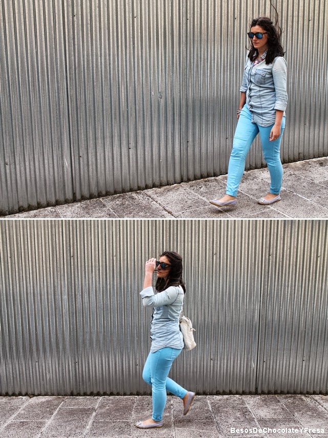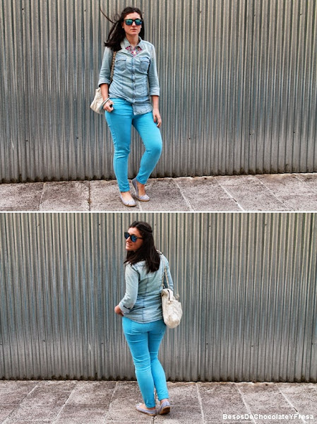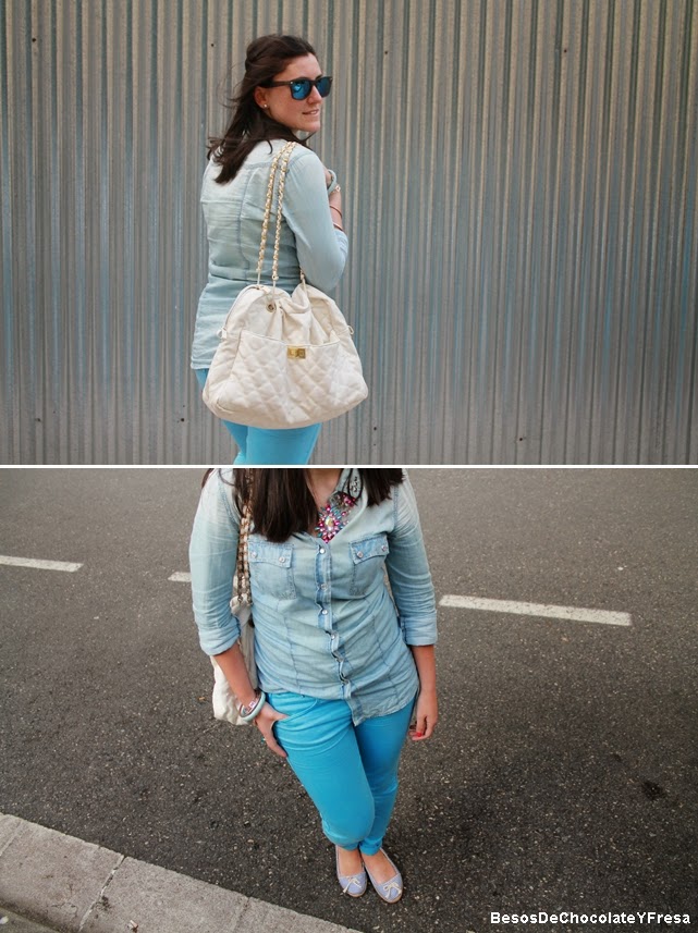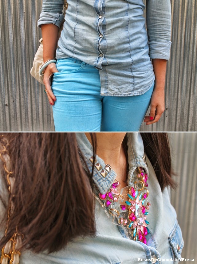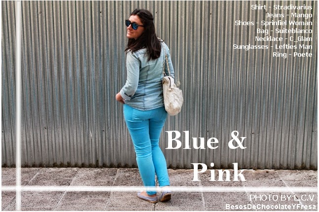 Hi! How about a week? And yesterday the night of San Juan? Today I show a look composed of blues and pinks. This Smurf blue jeans I wear with denim shirt and espadrilles as seaworthy accessories, white bag, blue Poete ring and necklace with blue jewel detail and pink to match the color of your nails.
