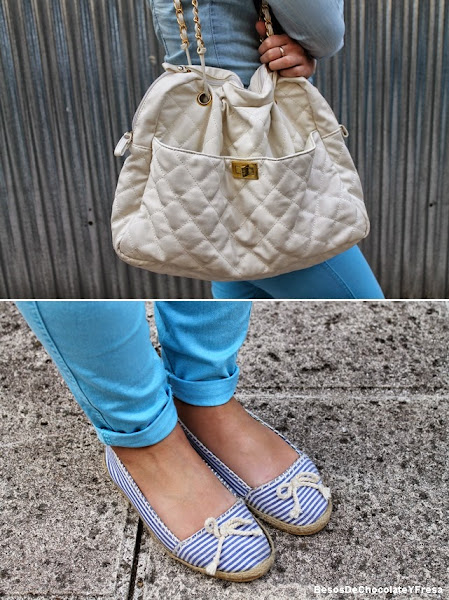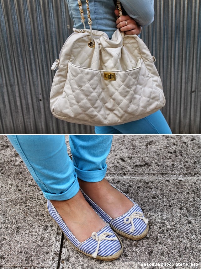 Hola!! ¿Qué tal la semana? ¿Y ayer la noche de San Juan? Hoy os enseño un look compuesto por tonos azules y rosas. Para ello llevo jeans azul pitufo con camisa denim y como complementos espadrilles marineras, bolso blanco, anillo azul de Poete y collar joya con detalles azules y rosas a juego con el color de las uñas.