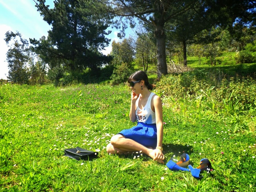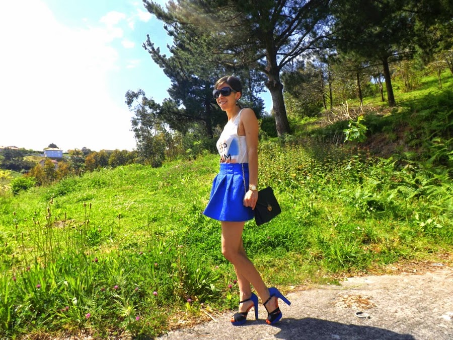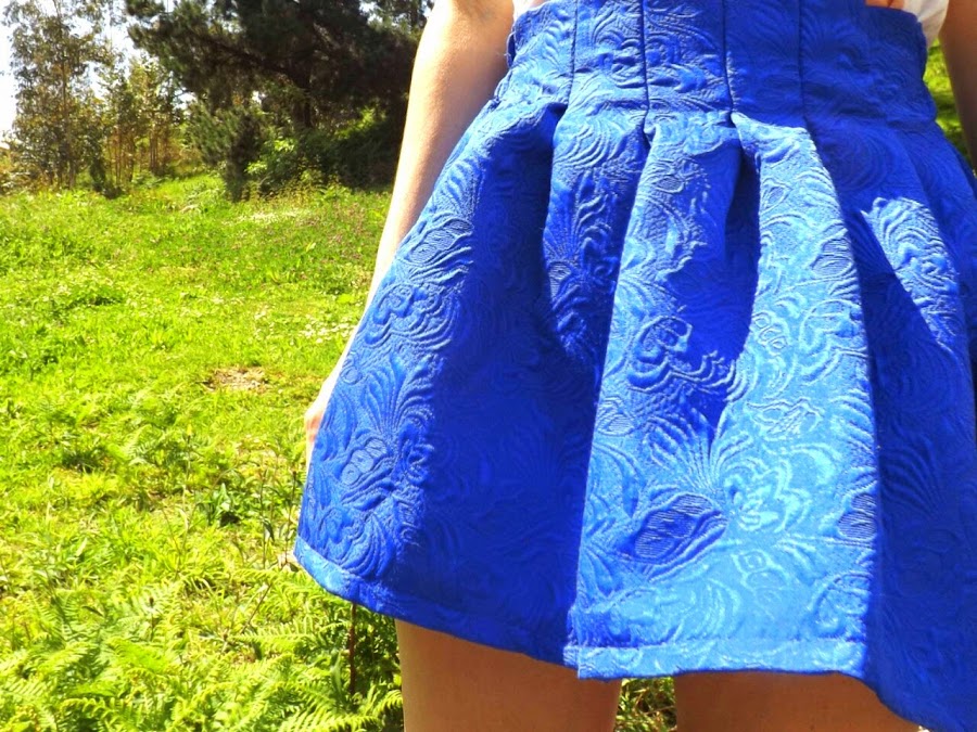 El azul de un mar en calma, el azul del cielo despejado, el azul de los ojos de ese amor que te tiene loca... Este verano va a estar marcado por el azul, un color luminoso, con fuerza y que nos favorece a todas. Sabéis que es uno de los colores que más uso y, aunque para mi gusto su pareja ideal es el amarillo, con el naranja no se lleva nada mal. Así que para hoy, he combinado estos dos colores en un look en el que destaca mi maravillosa falda de jacquard.