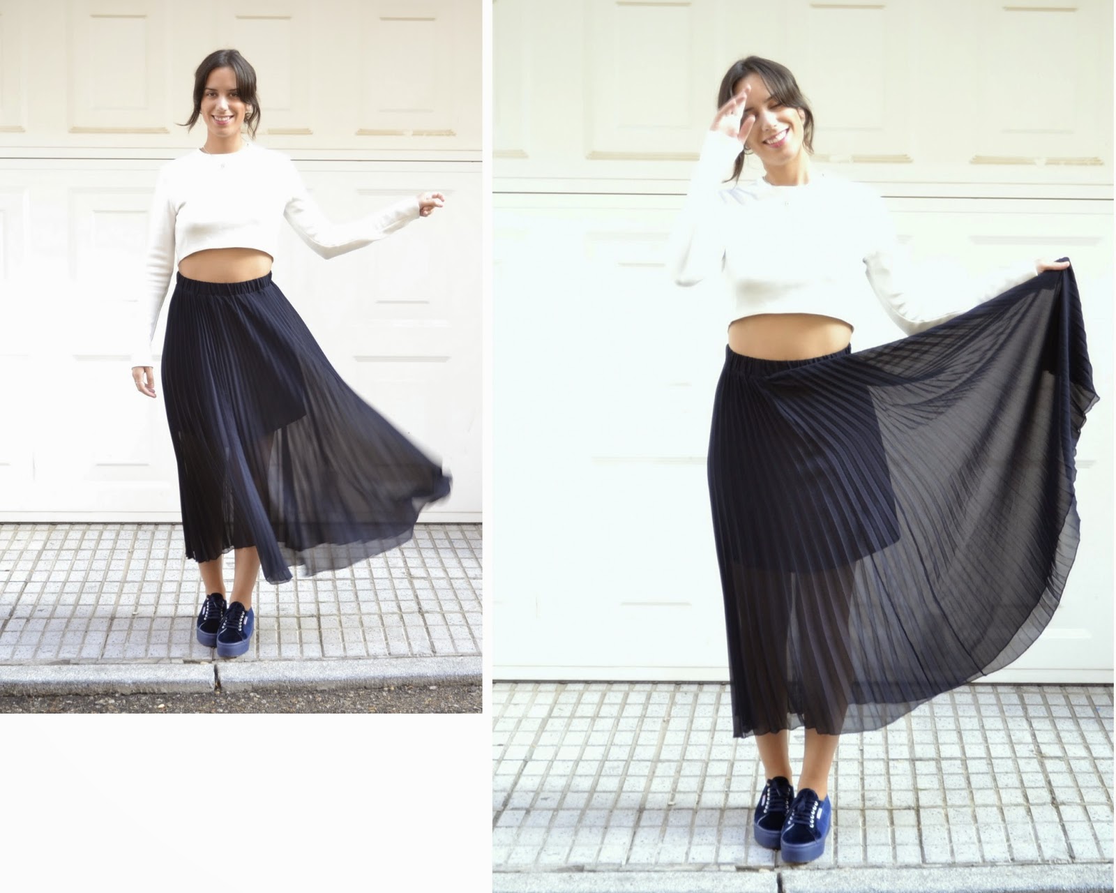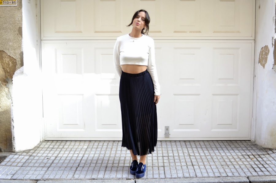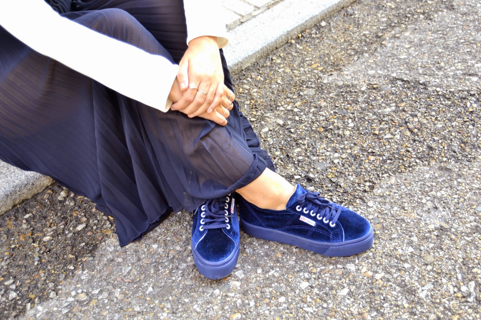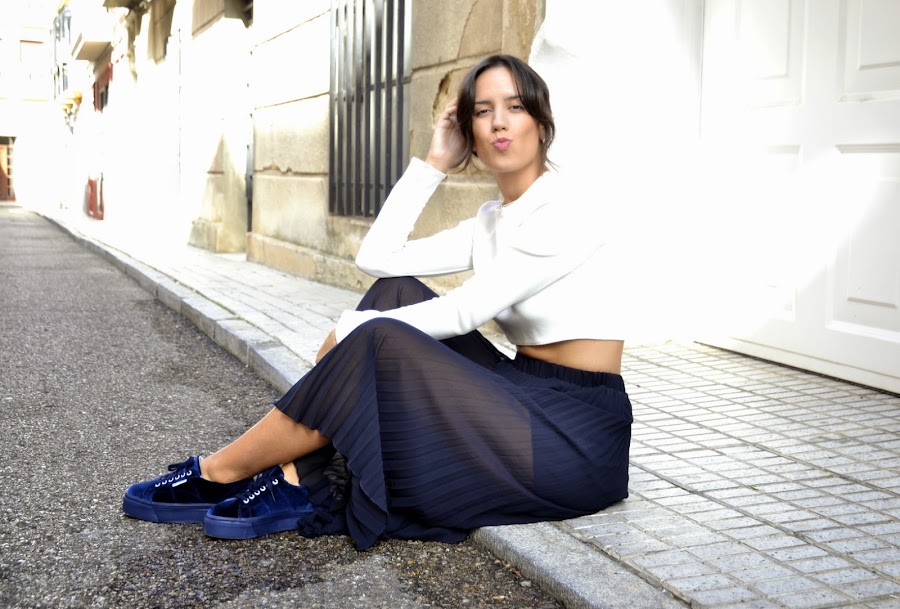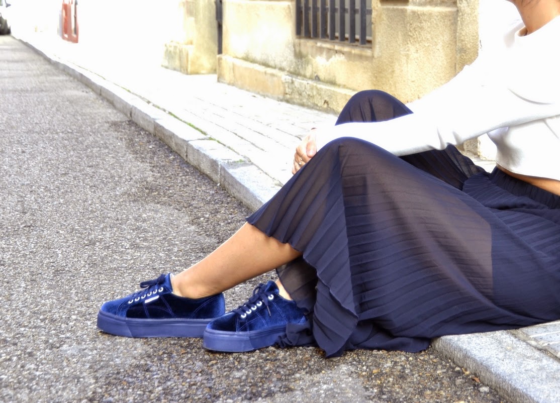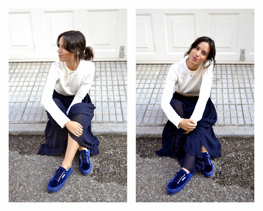 Siempre me han gustado las faldas de tablas y colores oscuros, y mejor si el corte es midi. Ésta me encantó porque tiene un largo diferente. Siempre me he decantado por llevar calzado arreglado con ella, pero me gustó la mezcla de éstas Superga azules velvet. Sabéis que soy muy partidaria de las sneakers a diario, y normalmente las llevo en colores neutros y sencillas, pero cuando vi éstas en Portobello Badajoz me parecieron muy originales y perfectas para otoño-invierno.