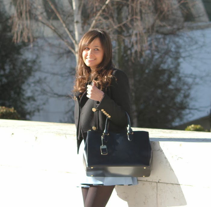 Por fin enseño look con la ya famosa falda azul bebe, revisando Instagram veo que exactamente llevaba 8 semanas en mí armario, aunque hace un par de semanas la estrené con este mismo conjunto para ir a la Ópera. Es ese tipo de prendas que te gusta tanto como para comprarla impulsivamente, luego llegas a casa te la pruebas y empiezas a pensar cómo combinarla.... ¡pero! todas las ideas que se me venían a la cabeza eran sin medias y con calzado primaveral. Volviendo a la realidad la única opción factible es con medias negras, seguro que ya lo comenté alguna que otra vez pero las medias transparentes me horrorizan y creo que destruyen cualquier outfit por muy cuidado que sea, así a base de complementos negros y dorados creé el look de este post.