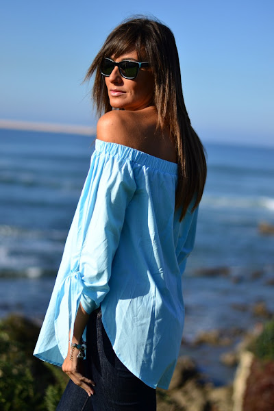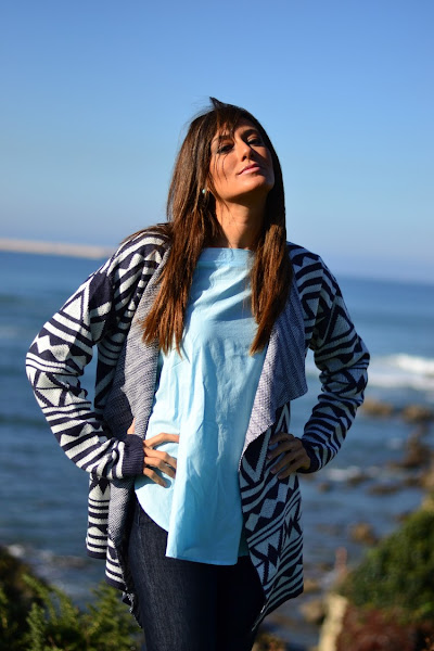 Hoy me gustaría iniciar la semana con alegría y optimismo, proponiendoos este look en tonalidades azules, ideal para esos días en los que brilla el sol, que se compone de un cárdigan asimétrico de estampado geométrico en azul marino y blanco de Romwe (al que, como podéis apreciar en algunas imágenes, también se le puede añadir un cinto para marcar cintura), una blusa de escote barco en azul cielo de SheIn y unos jeans oscuros de corte recto de Salsa.