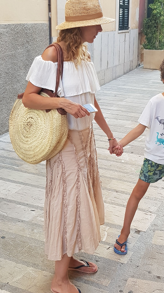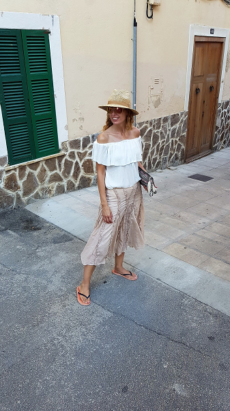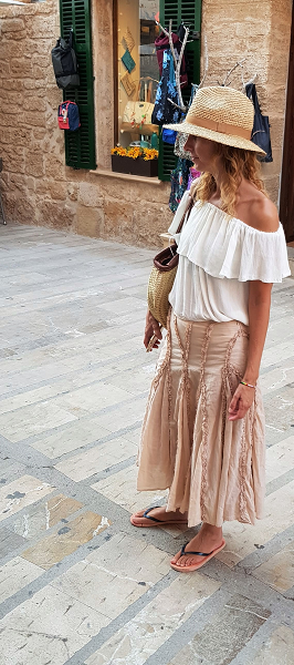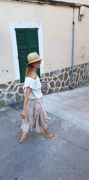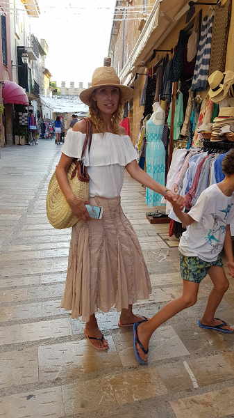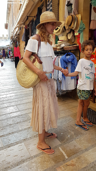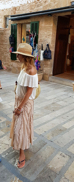 Calles preciosas y las tiendas que invitan a entrar todas de lo bonitas que son. Así que nos han quedado unas fotos preciosas en un lugar maravilloso de la isla. Y acabé comprando un bolso también estupendo. Así que la blusa de bambula blanca, el bolso nuevo y el entorno han quedado que parece hecho a propósito.