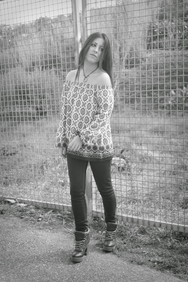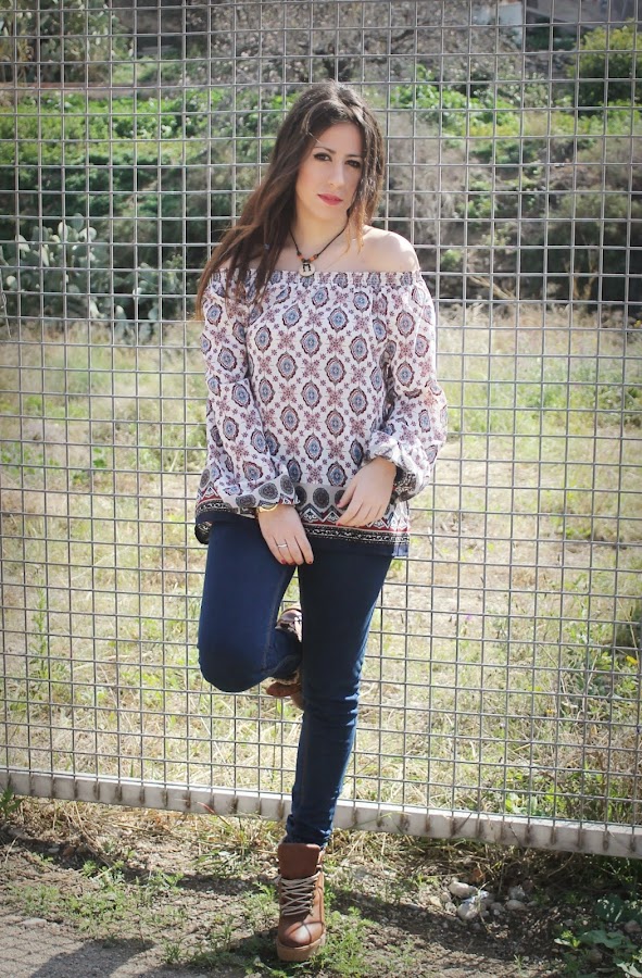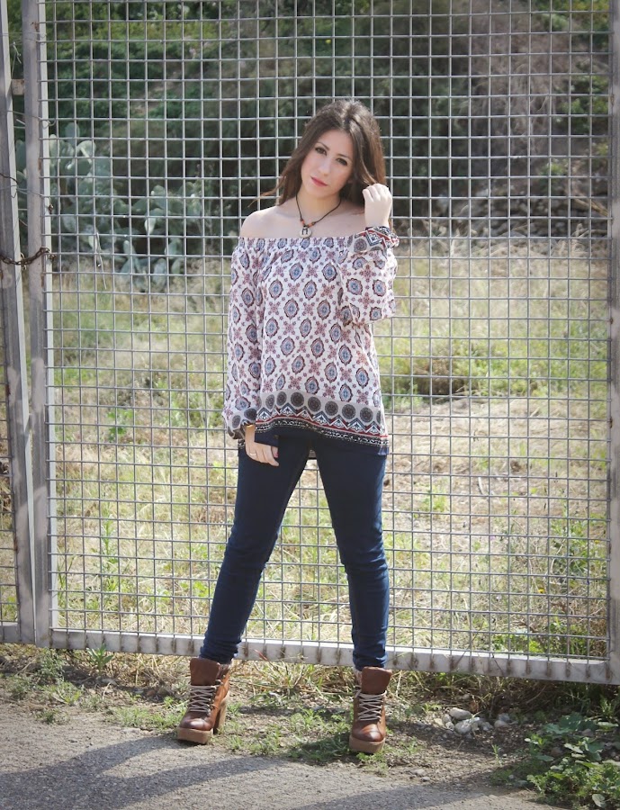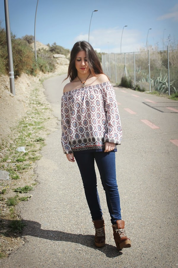 Que las prendas con los hombros al aire son tendencia esta primavera-verano no es ninguna novedad a estas alturas. El estilo boho ha llegado para implantarse como la tendencia estrella. Todo se lleva de flecos, encajes, volantes, ante, estampados étnicos etc. Obvio que fue ver esta blusa en Bershka y enamorarme, además es tan fácil combinarla, shorts vaqueros y mi bolso hippy, en el pelo como veis ...