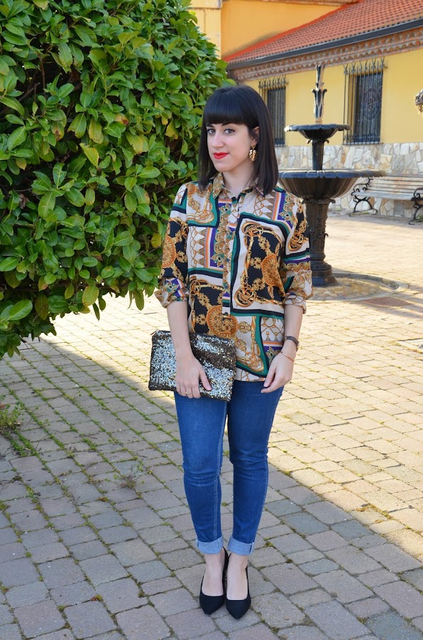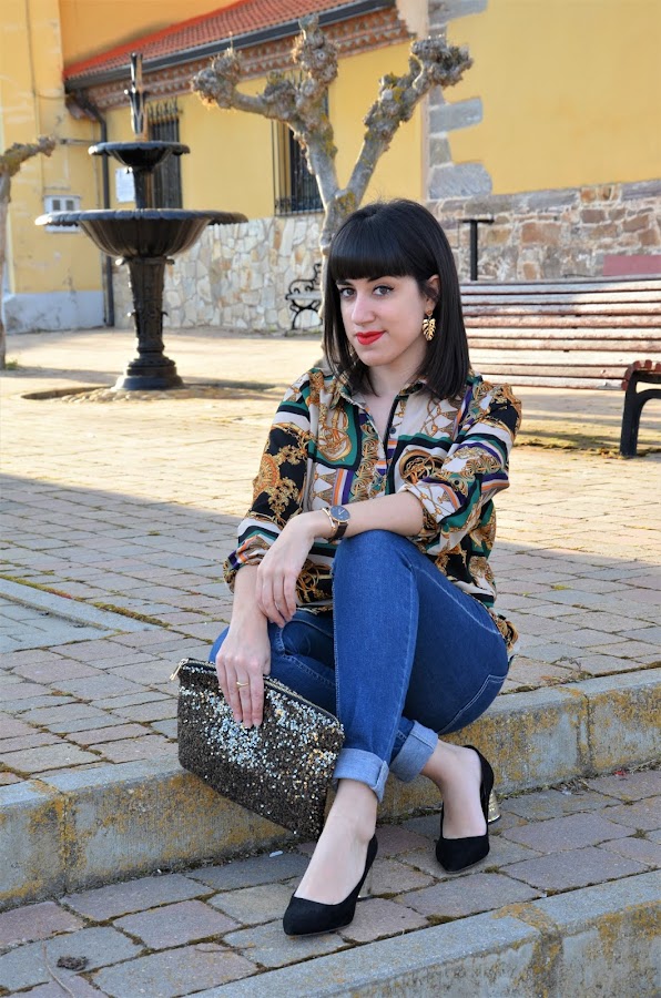 Lo he combinado con jeans y accesorios en tonos dorados, como los zapatos, de Lefties, que no pueden ser más cómodos y elegantes, o los pendientes de hoja y el clutch de lentejuelas.