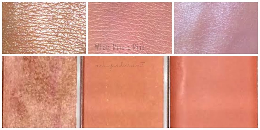 Whats Mine is Mine es un trio con tonos melocotón, el iluminador es como un tono achampanado con mucha luz, el colorete en polvo es un melocotón con partículas rosas y doradas y el colorete en crema aunque parece más bien salmón cuando se difumina en la piel adquiere un tono rosáceo .