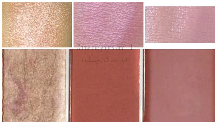Show Me Yours and I`ll contiene un iluminador con un ligero subtono rosa, el colorete en polvo es más bien rojizo, sin embargo aplicado en la piel al difuminarlo el resultado tira más bien a rosa. El colorete en crema tira más bien a rosa palo, es un tono ideal para dar un toque de frescor a las pieles más claras.