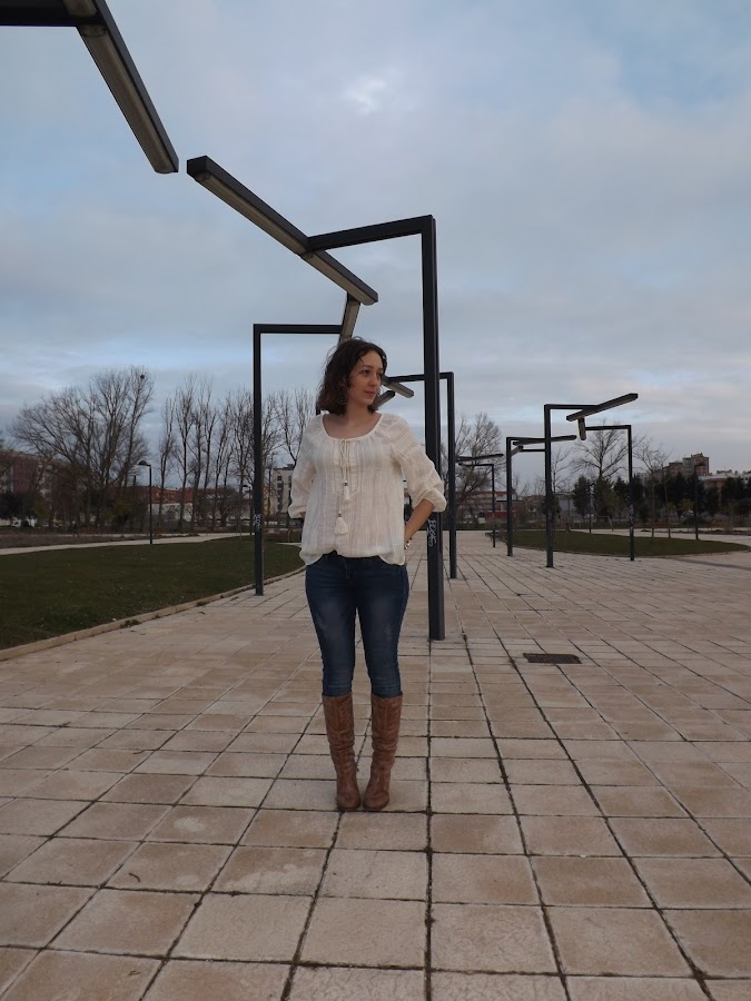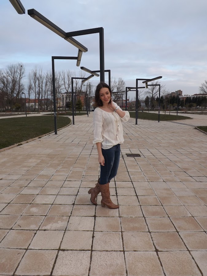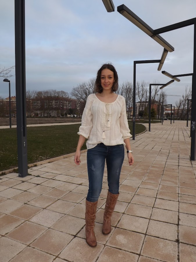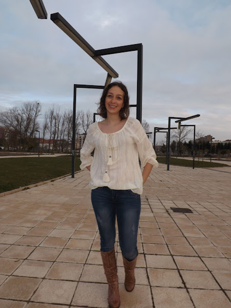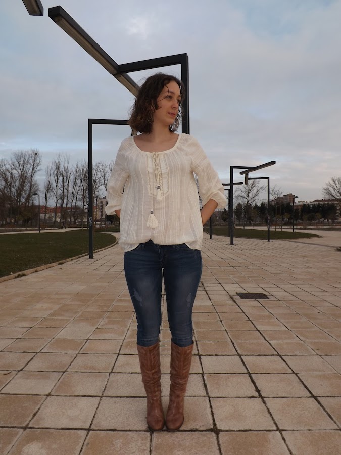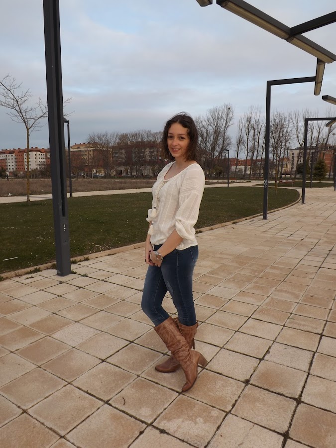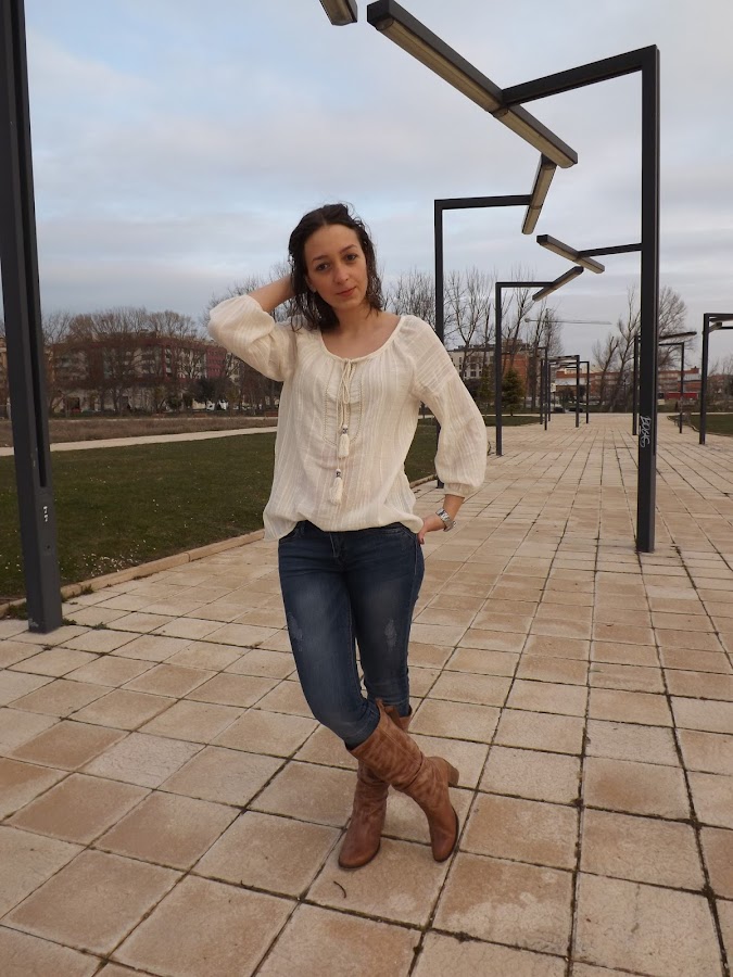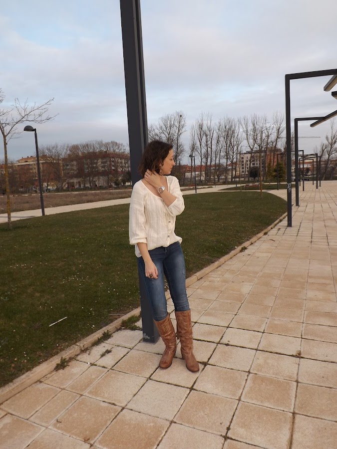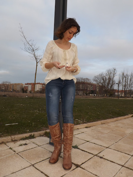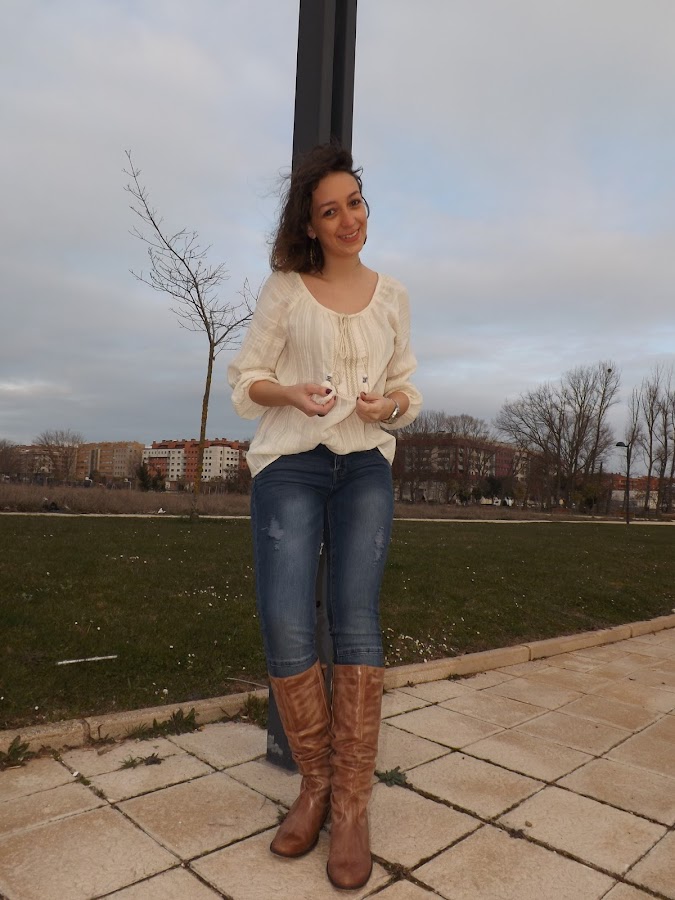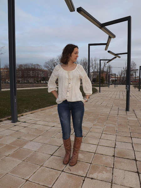 Para el post de hoy he elegido el look que llevé el Viernes Santo. El plan fue ir hasta Covarrubias (un pueblo precioso de la provincia, en el que por la noche hacen una procesión viviente). Me apetecía muchísimo estrenar esta blusa que me regaló mi madre. La idea era combinarla con una faldita nueva que también me regaló pero el tiempo no acompañaba para poderla llevar sin medias, así que no me quedó otra que llevarla con pantalón. Unas botas altas y poco más necesité para ese día.