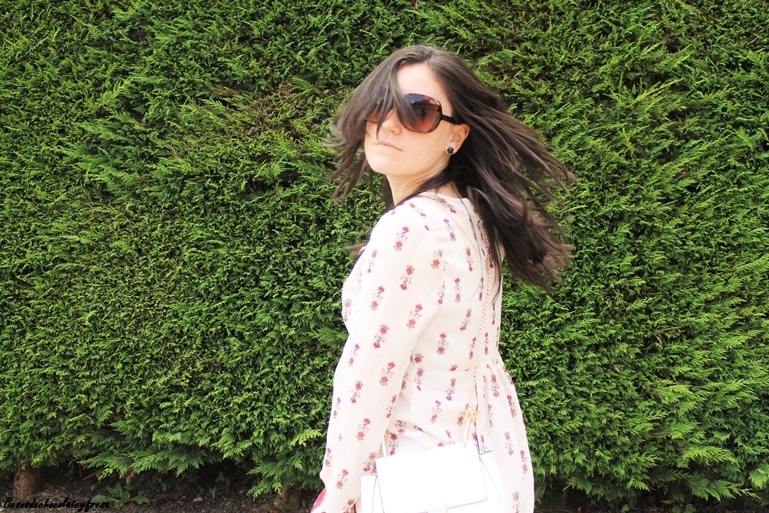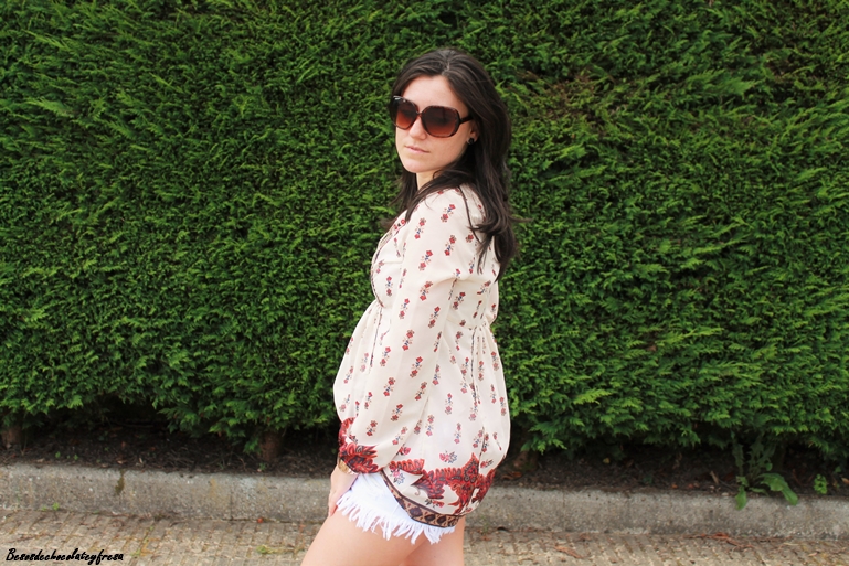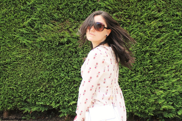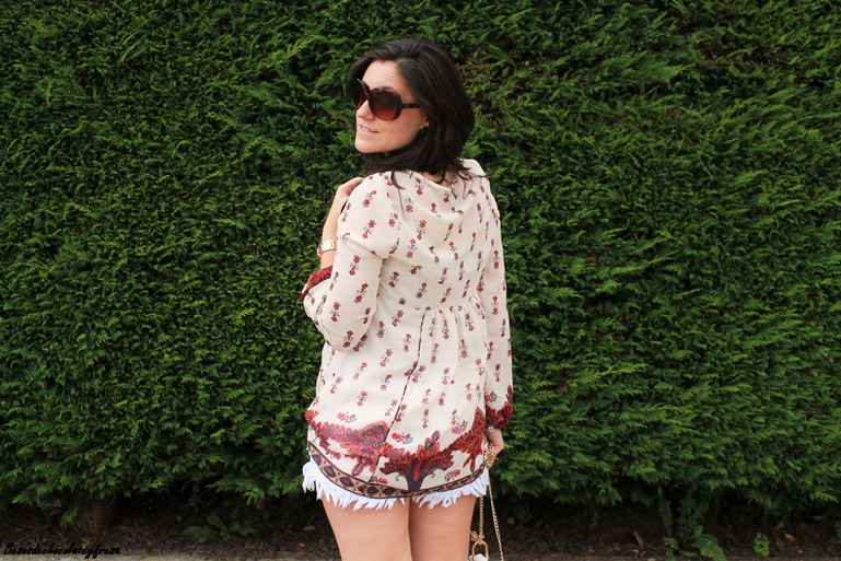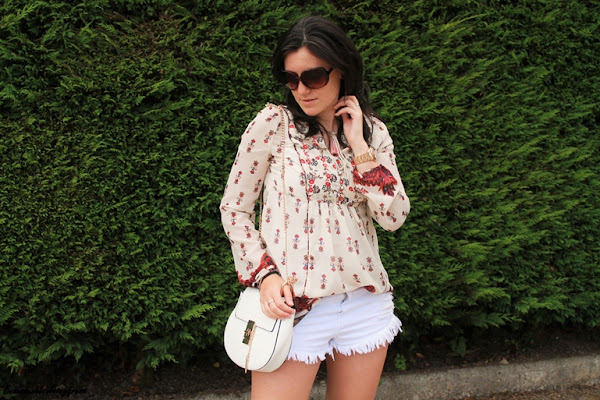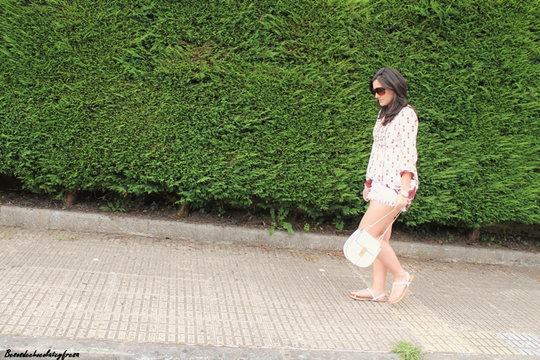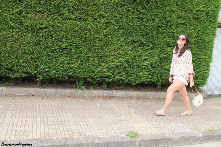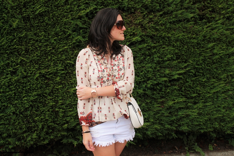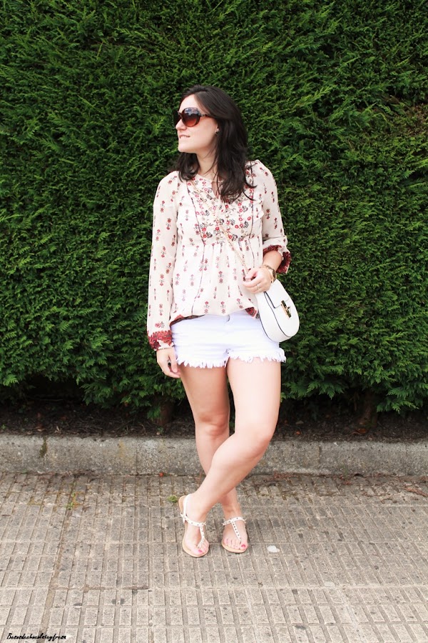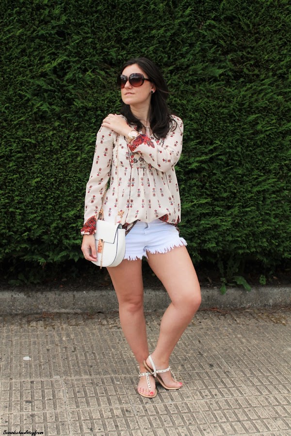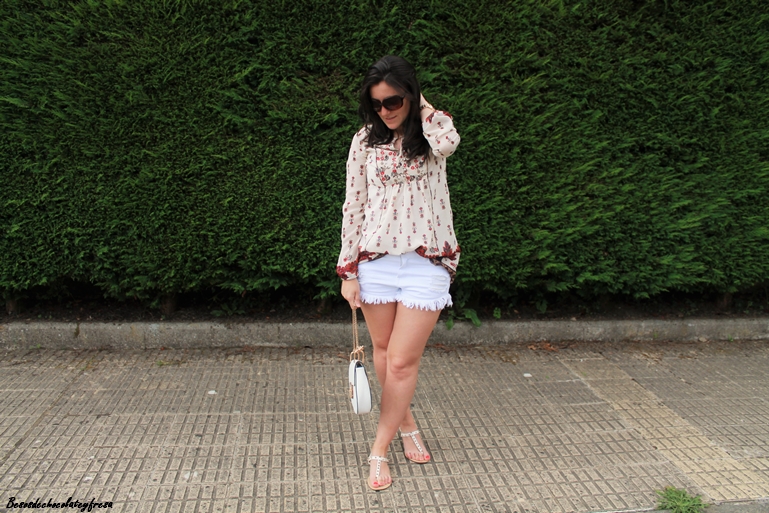 Hoy os muestro un look muy veraniego con bluson en tonos tierra y shorts en blanco que ya os enseñé hace unas semanas y que me resultan súper cómodos para mis recados diarios. Lo que viene siendo un total look de Primark porque las dos piezas fundamentales son de esta tienda. Completo el look con bolso en blanco y sandalias de pinchos en dorado y blanco.