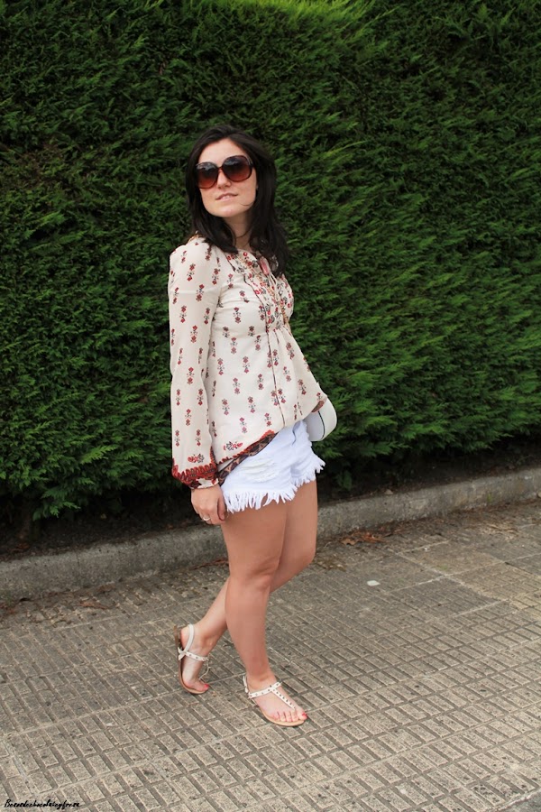Today I show you a very summery look with blouse in shades of Earth and shorts in white that I already taught a few weeks ago and I are super comfortable for my daily errands. What is being a total look of Primark because two fundamental parts are from this store. Complete the look with skewers in Golden sandals and white and white bag.