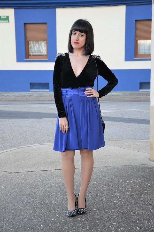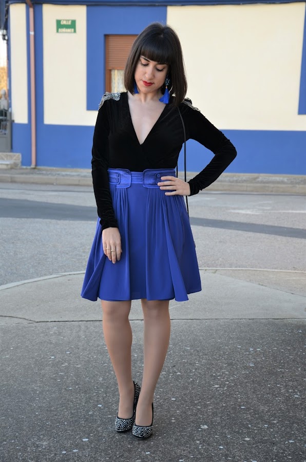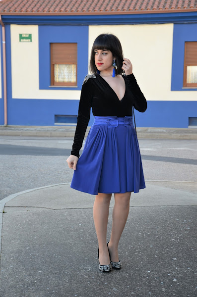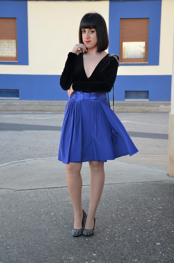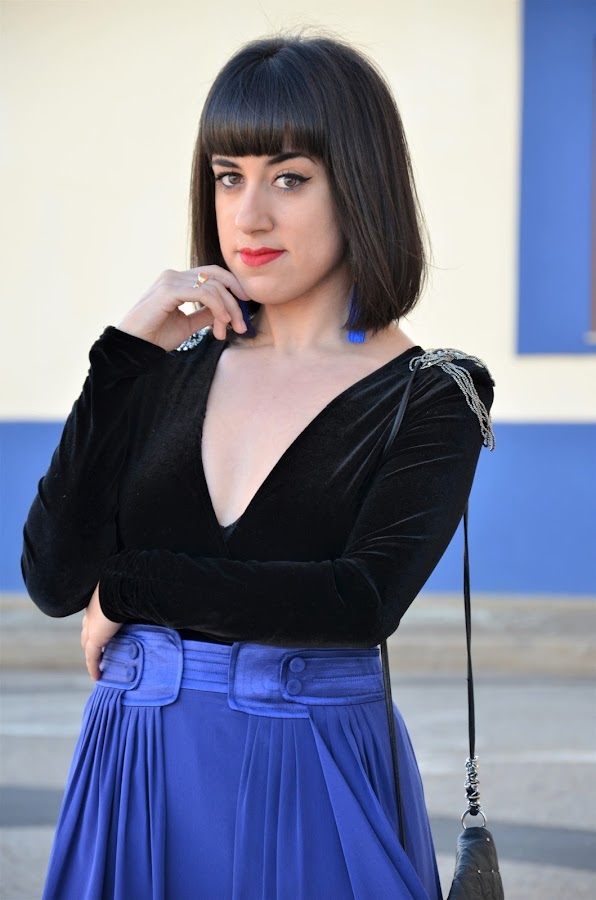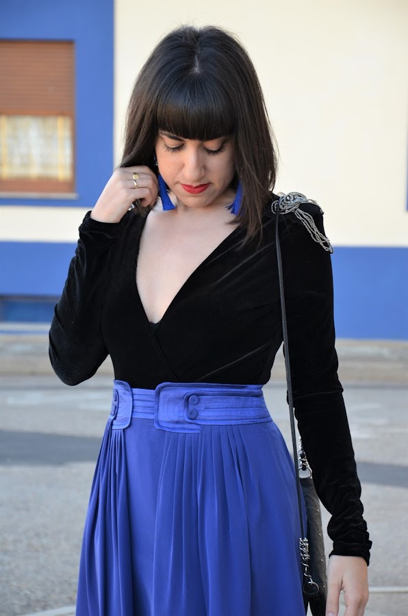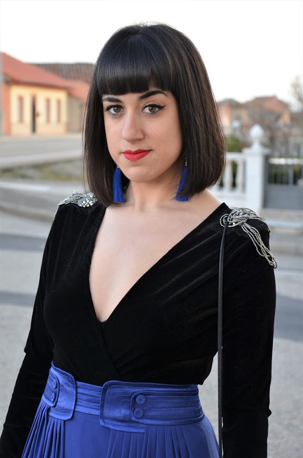 El body es de terciopelo, súper elegante, escotado pero sofisticado. Los detalles los tiene en los hombros con cadenas de abalorios en tono plateado y también lleva hombreras para darle mas cuerpo a la prenda. No se vosotras, pero a mi me encantan las prendas que llevan hombreras discretas, les aportan mucha personalidad.