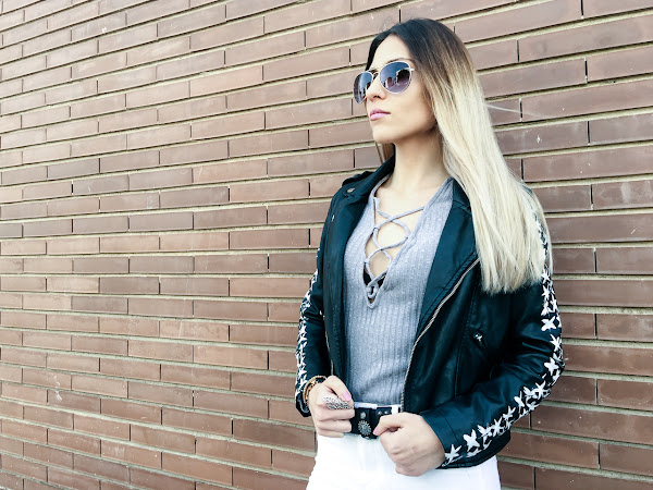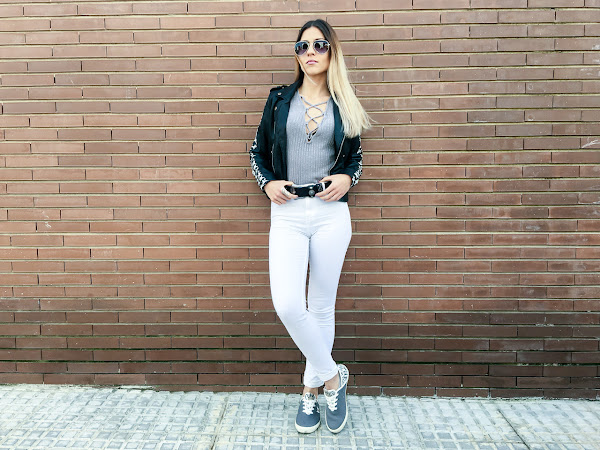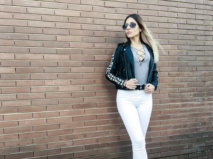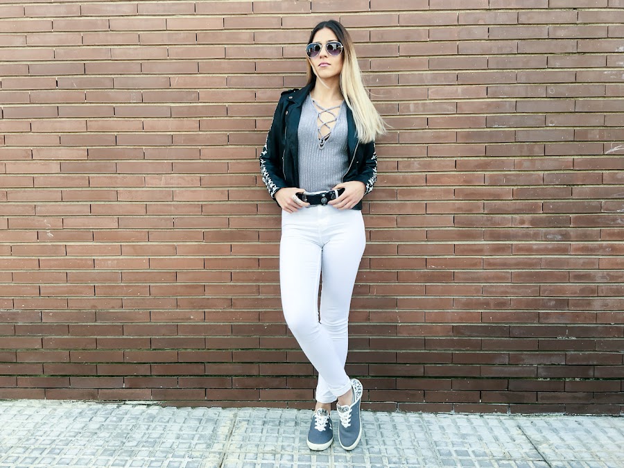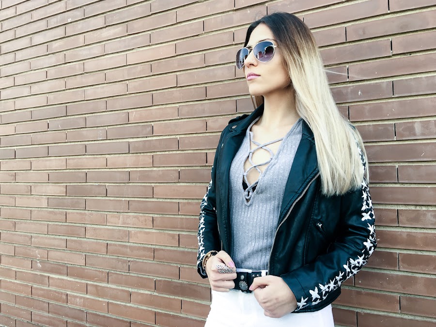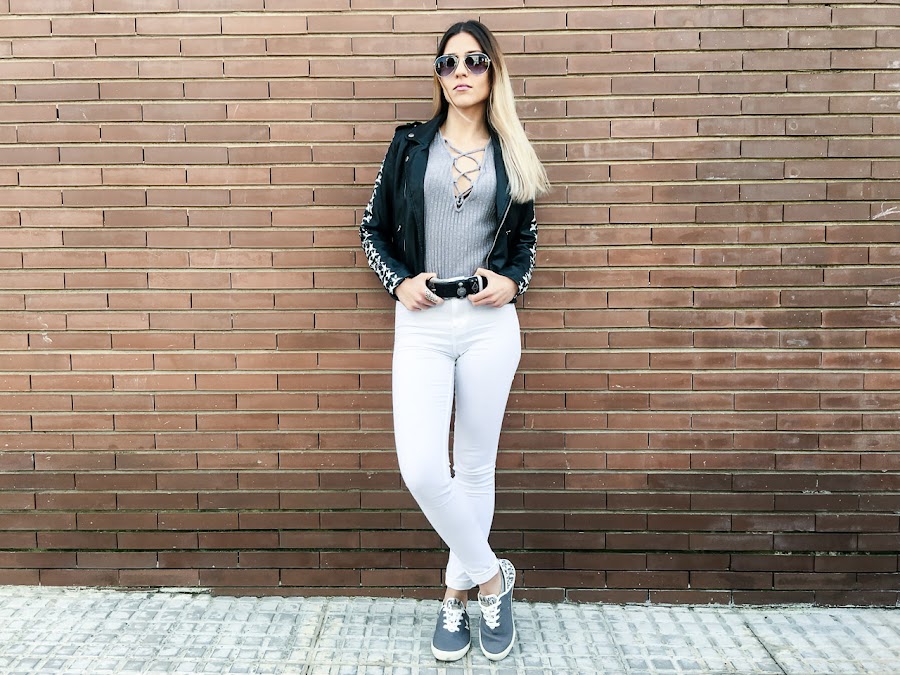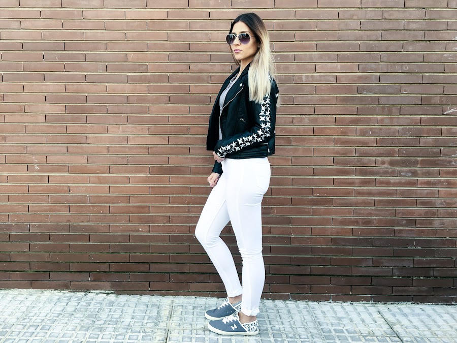 Lo he combinado con unos jeans blancos y mis zapatillas grises y blancas, las cuales tienen un estampado súper bonito imitando una ciudad en la parte de los talones. Y para rematar el look, mi biker negra con estampado de estrellas en las mangas.