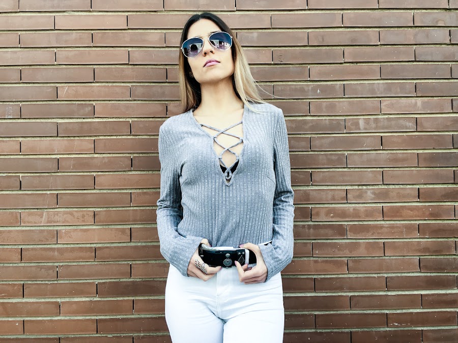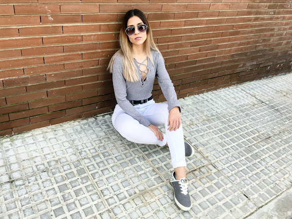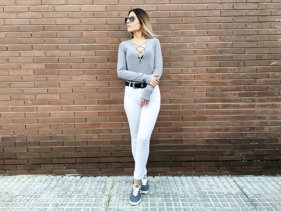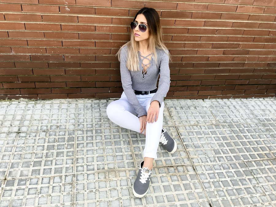 Hoy os traigo un look casual y cómodo, pero muy cañero. El protagonista de la noche de domingo es mi body gris canalé de escote de cordones que tanto se lleva.