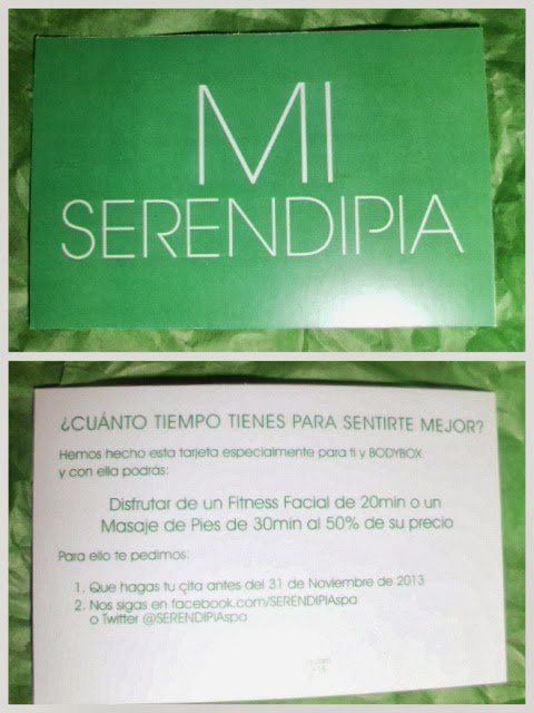 Serendipia Spa. Una oferta exclusiva, solo para sucriptoras de la Bodybox. En la tarjeta vienen las condiciones.