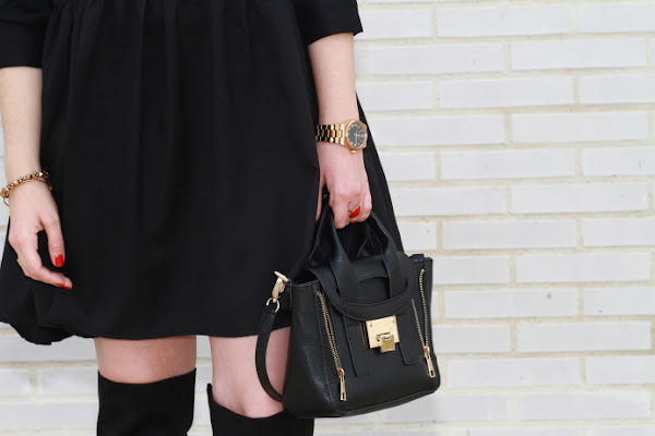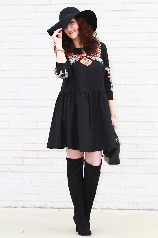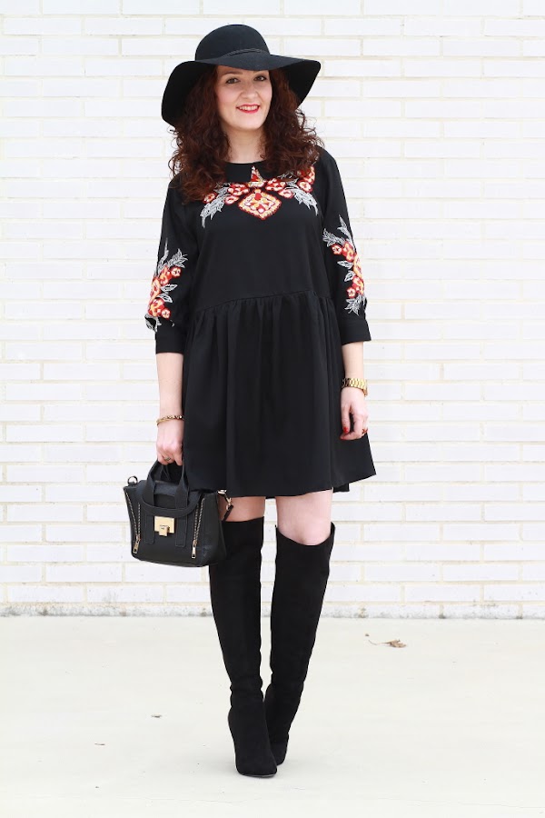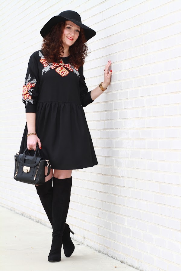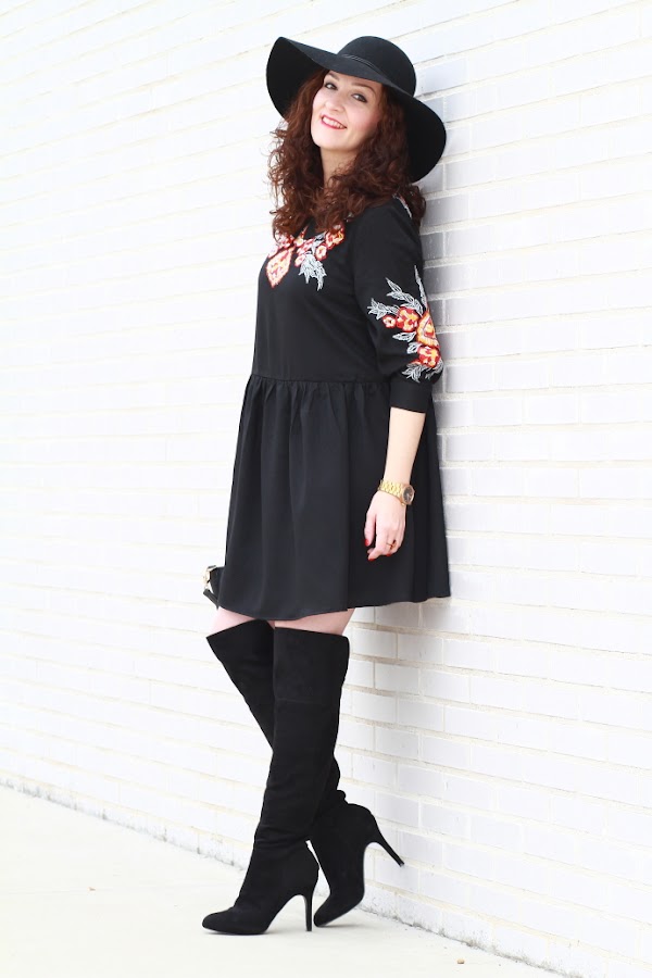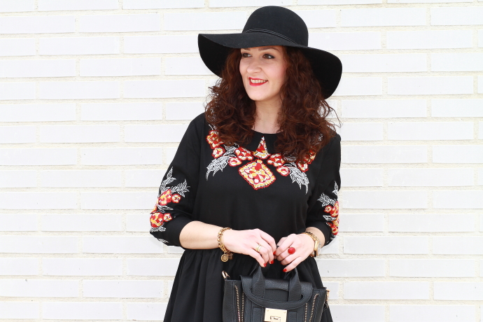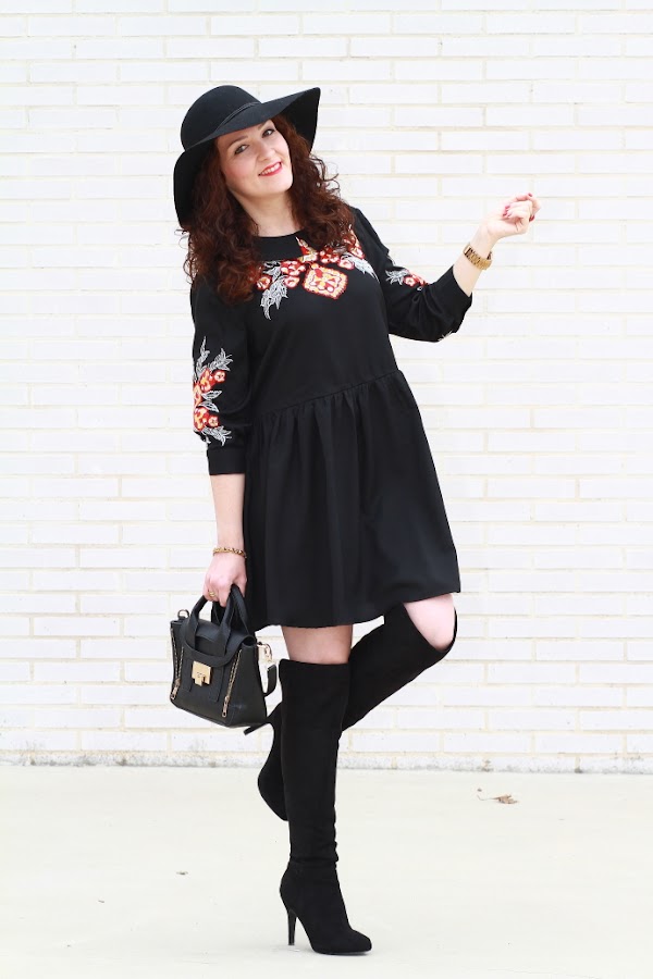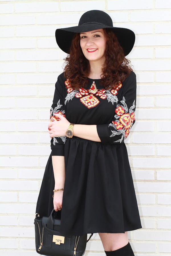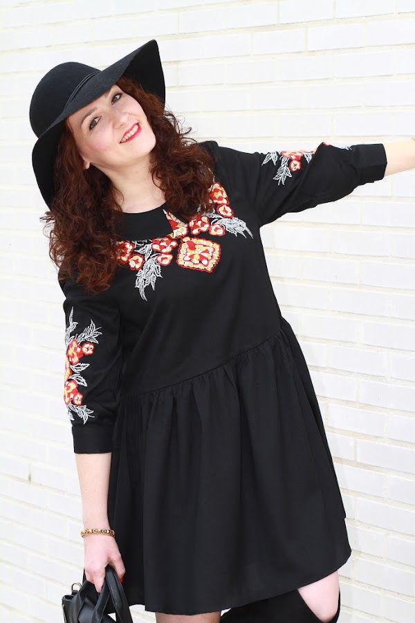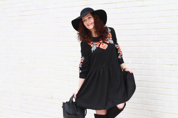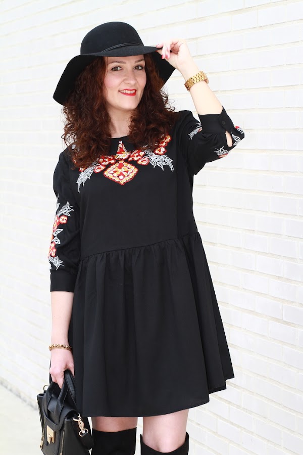 Aunque intento introducir más color en mis estilismos no puedo evitar fijarme en las prendas negras. Lo primero que me llamó la atención de este vestido por supuesto fue el color, pero luego, el bordado de flores junto con el corte boho me convencieron de tal manera que no lo dudé y como veis hoy ya lo llevo puesto. Unas botas por encima de la rodilla, el sombrero fedora y un mini bolso cierran un look de aire bohemio de los que tanto me gustan.