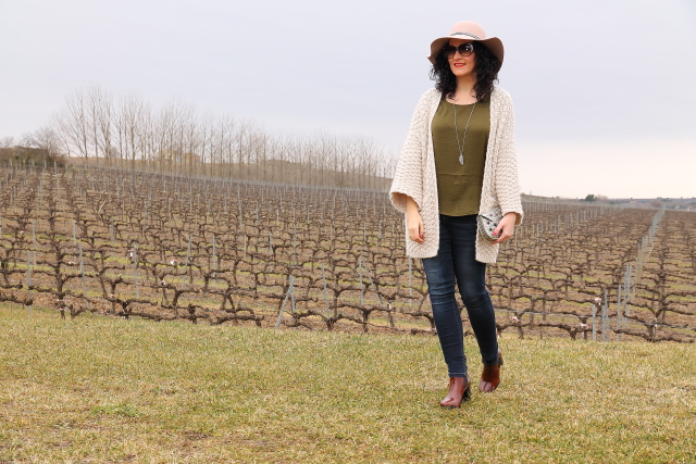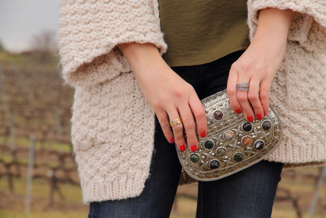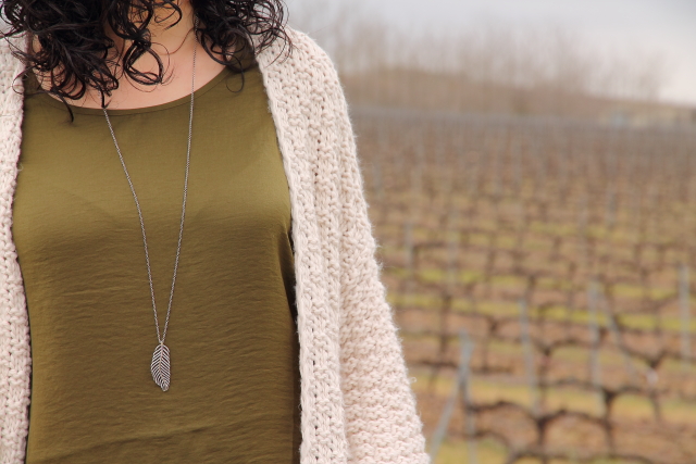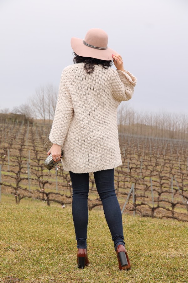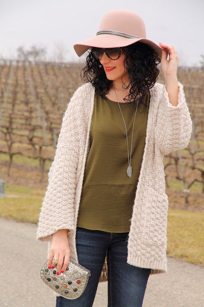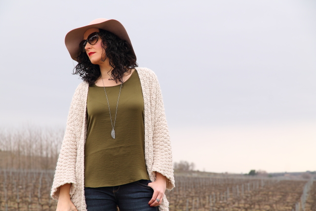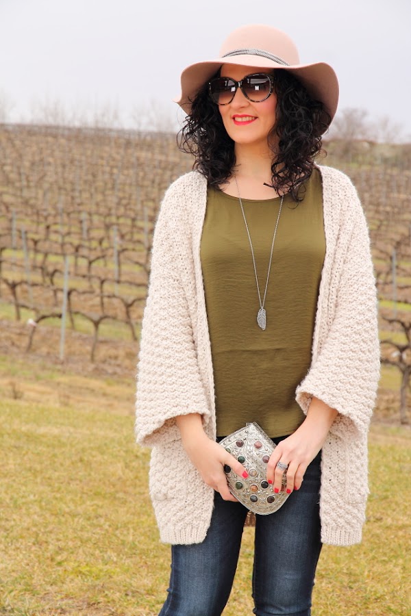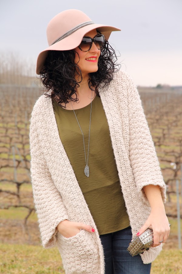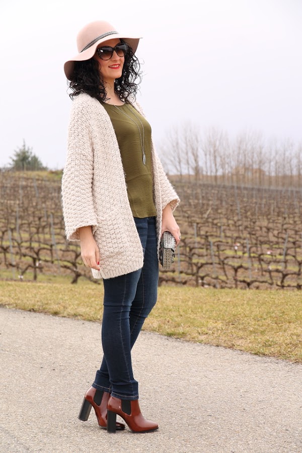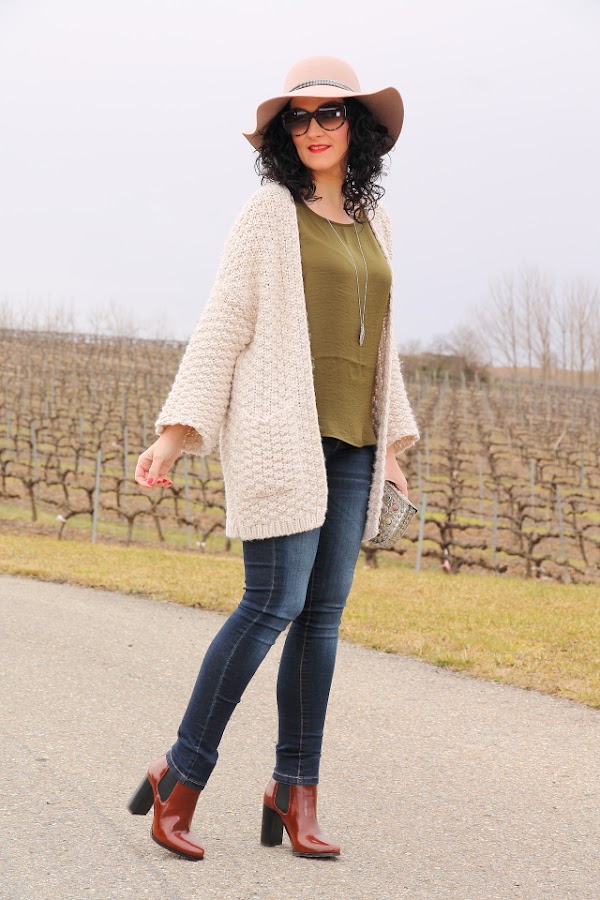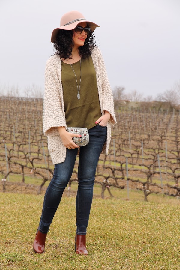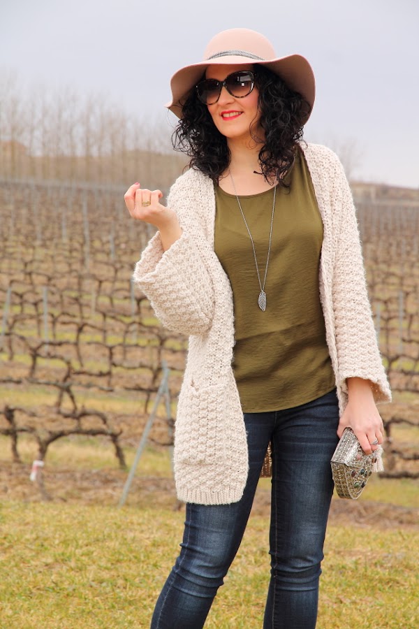 No se qué tiene este look que me vuelve loca. La verdad es que no puede ser más sencillo, un oufit en el que combino unos jeans pitillo azul oscuro, top caqui, cardigan gordito en crudo y botines marrones. Yo creo que me gusta especialmente por el toque boho chic que le dan los complementos, ya sabéis que soy muy fan de este estilo. El sombrero fedora junto con el colgante y anillo de la pluma y el bolso metálico consiguen darle la vuelta a este look.