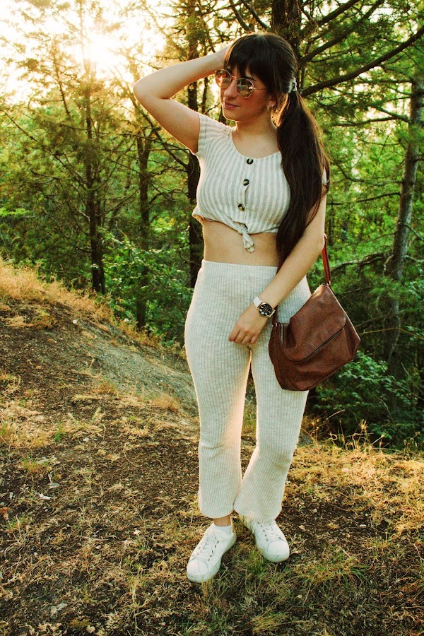 Dicho esto, hablando del outfit; el conjunto top y pantalón suelto son ambos de la nueva colección de Lefties, que por cierto estaban a buen precio y cuyo conjunto es una monada. Lo he combinado con un bolso en tono marrón, plataformas deportivas blancas, el reloj de Zaful que ya os he enseñado anteriormente aquí (Link al post) y algún que otro accesorio más en dorado.
