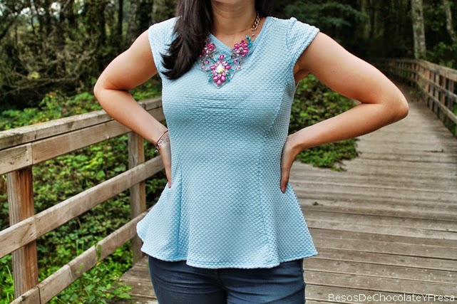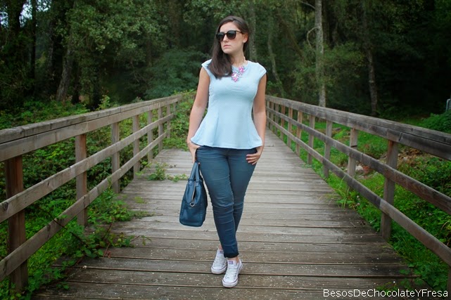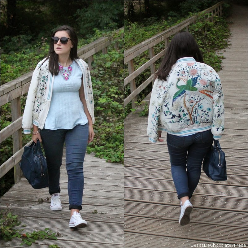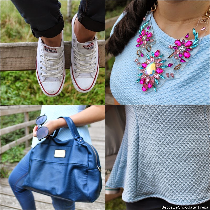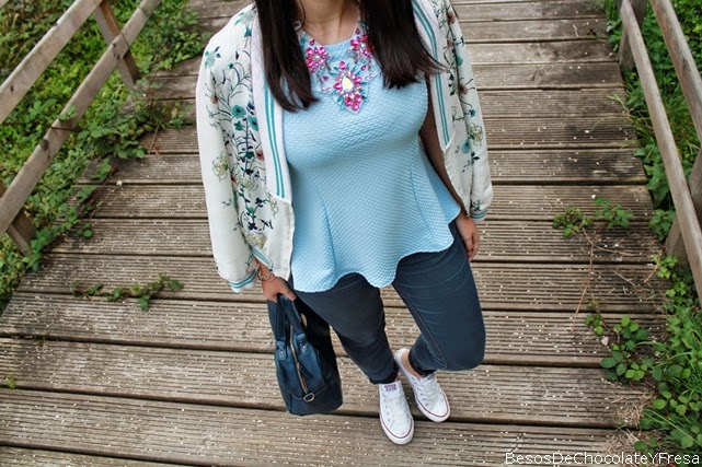 Hoy os muestro un look en tonos azul bebe. Llevo camiseta peplum en azul bebe de Primark de esta temporada con jeans y converse, bomber con motivos florales y como complementos bolso en azul marino y collar joya que tanto y tanto os gusta cuando os lo enseño a traves de Instagram :)