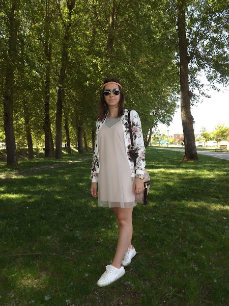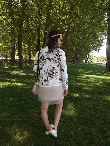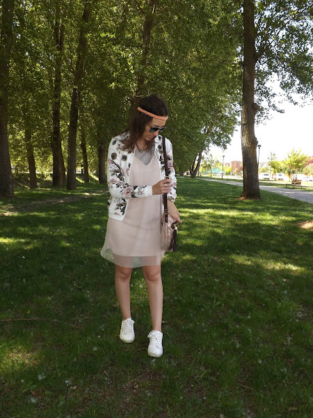 El look de hoy me gusta especialmente. El vestido ya os lo enseñé aquí de forma más arreglada. Esta vez lo combiné con una camiseta gris debajo, zapatillas, mi nueva bomber de Rosegal y una cinta en el pelo.