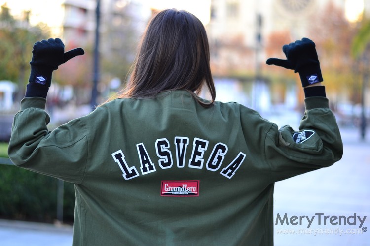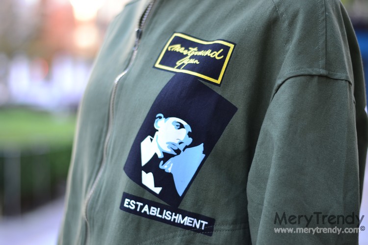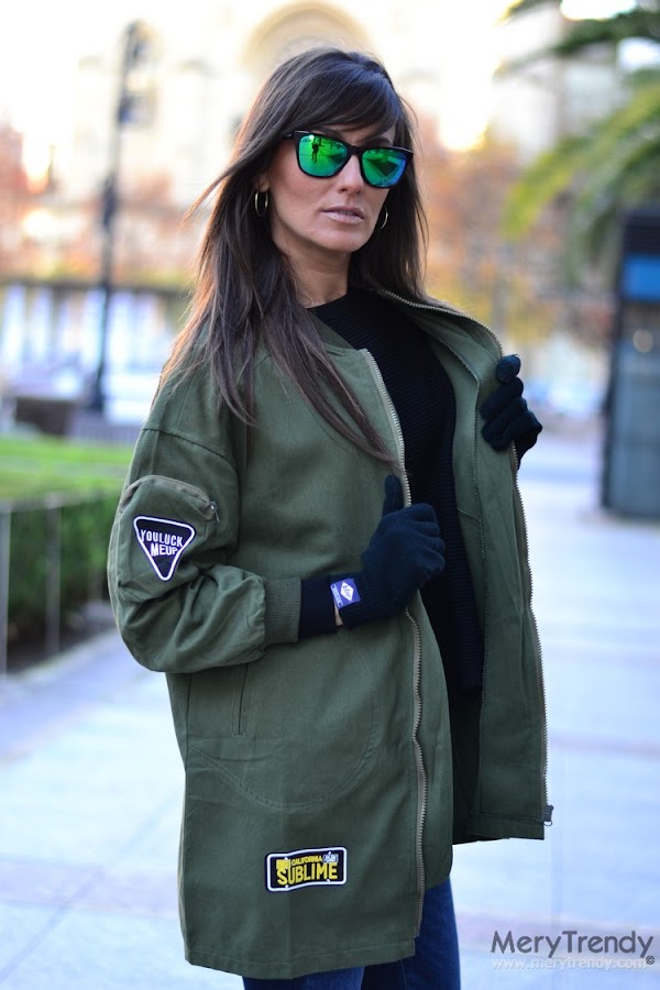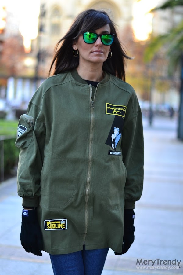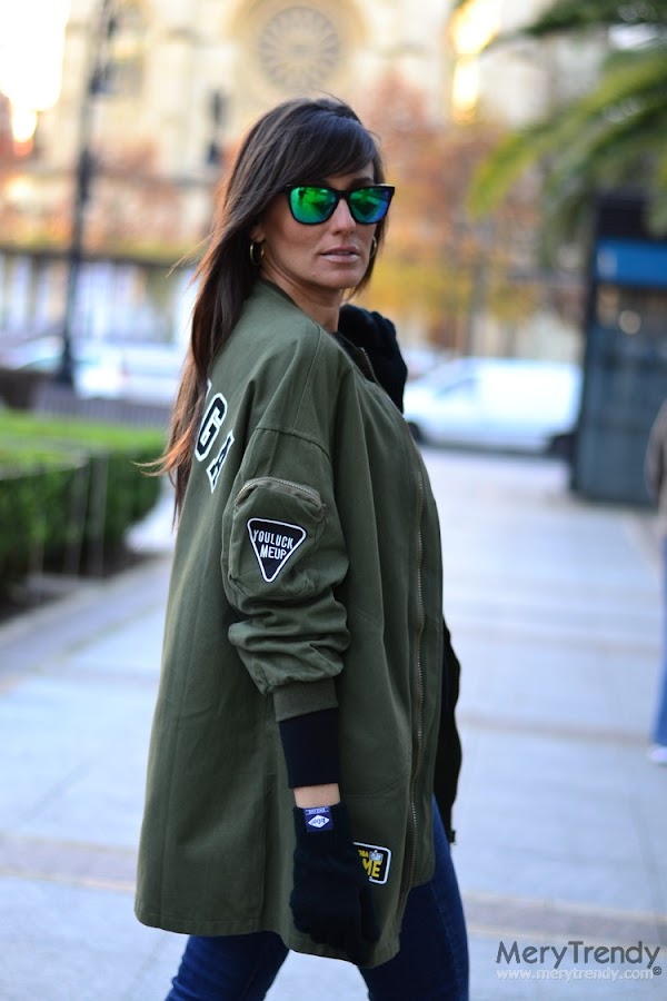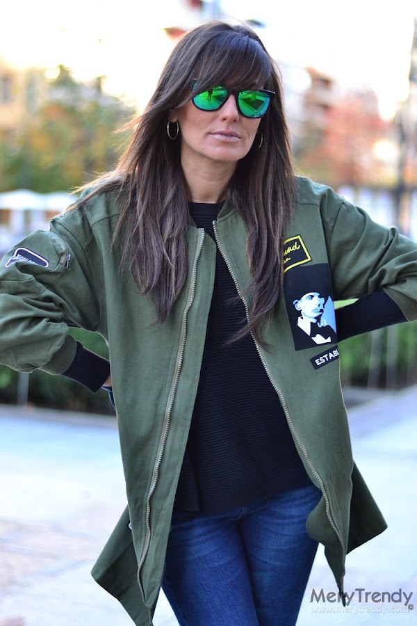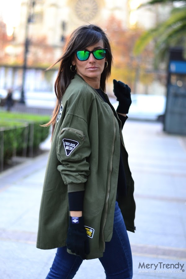 Hoy, la pieza central de mi look es esta cazadora bomber con parches, siguiendo el ya icónico patrón aviador, pero de corte recto y larga, en verde, con cierre de cremallera, cuello estilo baseball y puños con goma canalé, funcionales bolsillos delanteros y forro en contraste, con la que he tenido un auténtico flechazo. ¡No me puede gustar más!