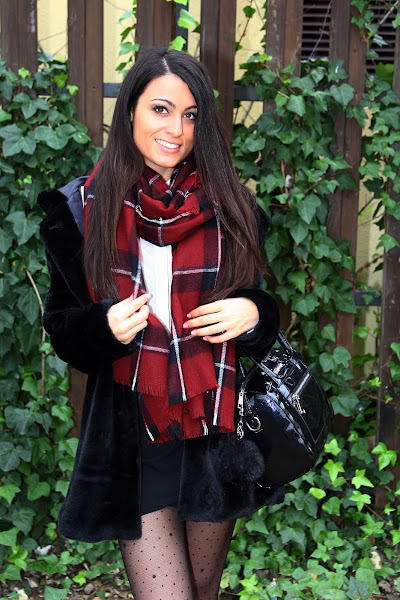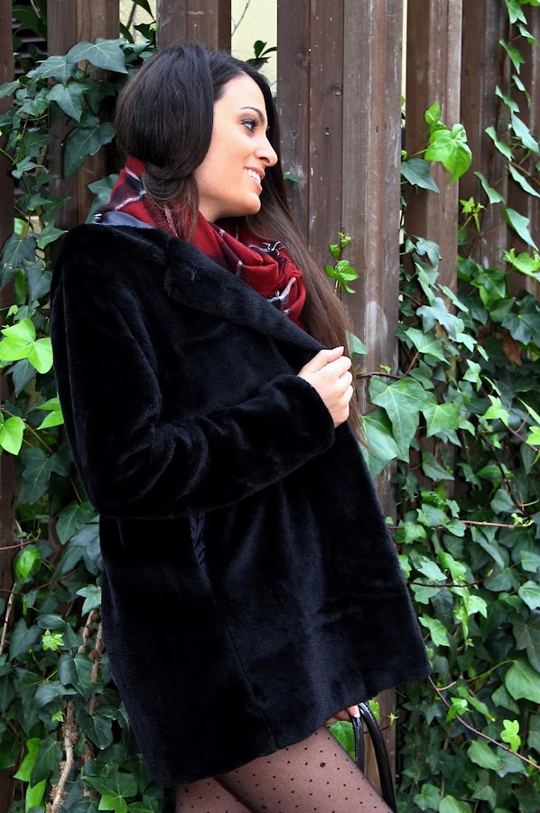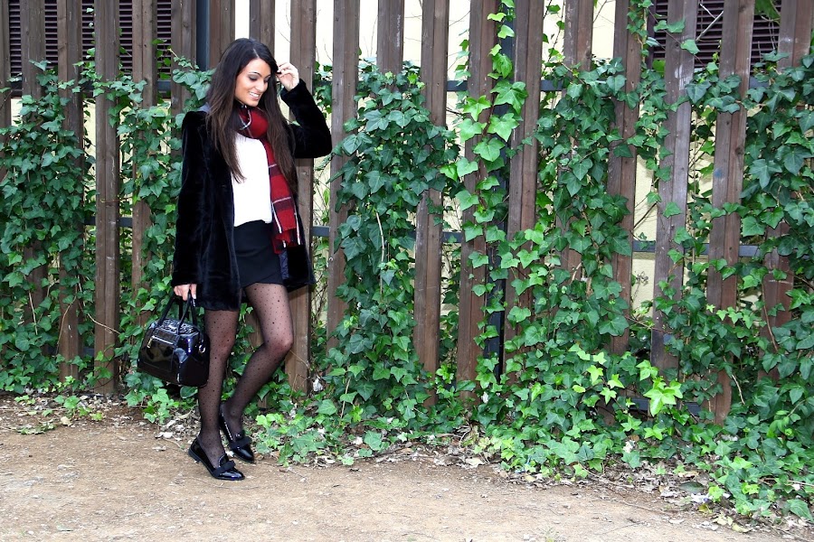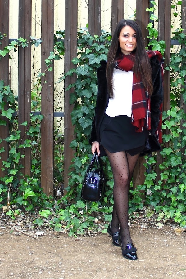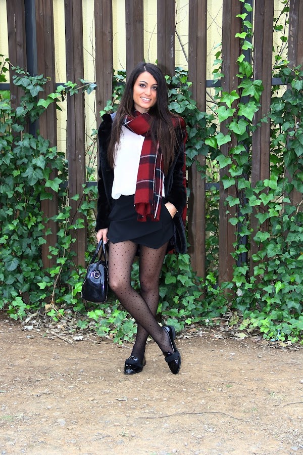 En el look de hoy he jugado con la combinación de diferentes estampados y texturas. En cuanto a los colores he apostado por el clásico y elegante blanco y negro dándole un toque de color con una preciosa bufanda. Además estreno este precioso abrigo de pelo negro de SheIn. ¿Qué os parece?