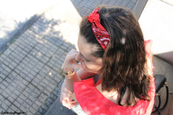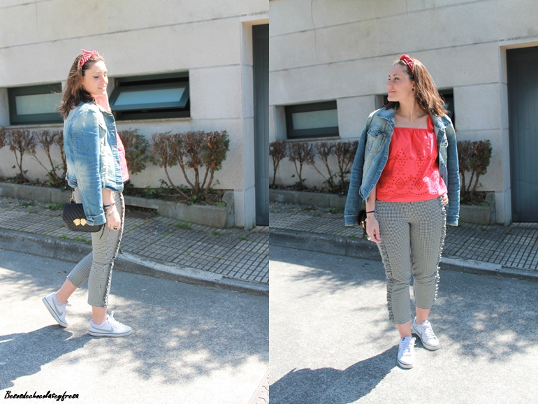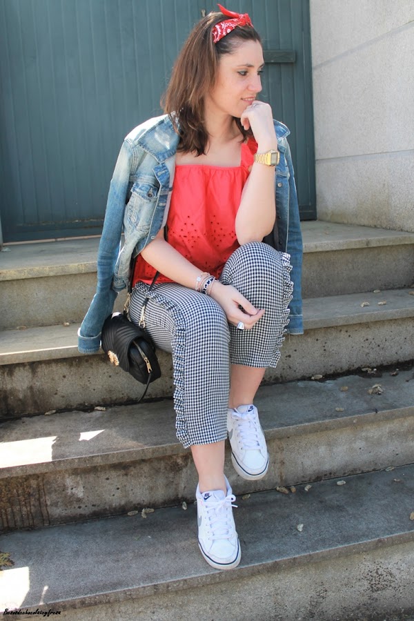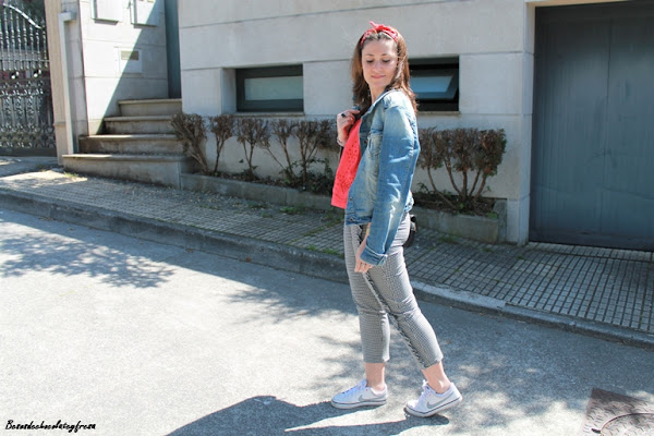 Completo el outfit con chaqueta denim, sneakers, bolso bandolera en negro y detalle de bandana/pañuelo al pelo esta vez a modo de diadema.