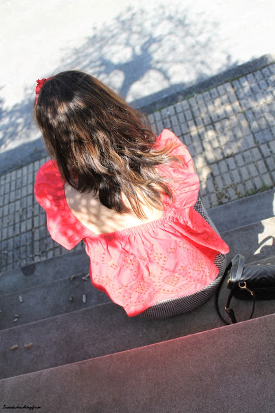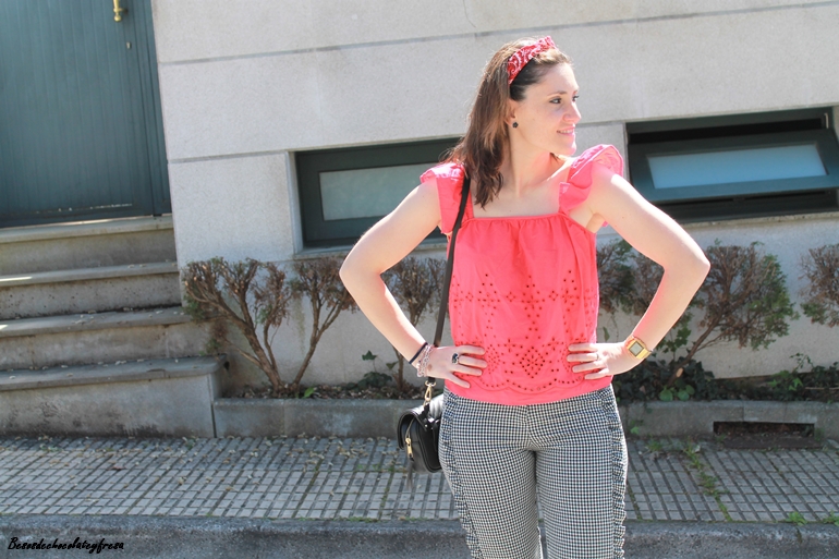 El top que os muestro hoy es de hace unas temporadas de Zara Kids, que decidí poner ante las buenas temperaturas de esta semana y cuyo bordado podemos ver en infinidad de prendas de temporada. El contraste de colores, rojo con el estampado vichy me parece que hace el look alegre a la vez que divertido con los pantalones de tiro alto, cuadro en blanco y negro y volantitos en los laterales.