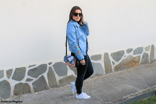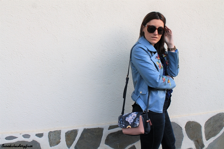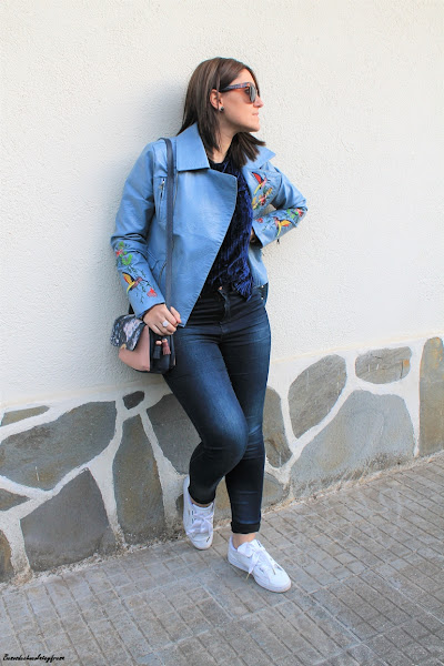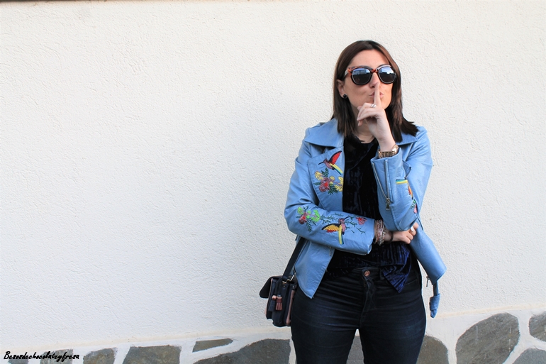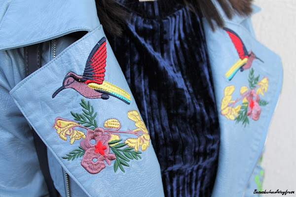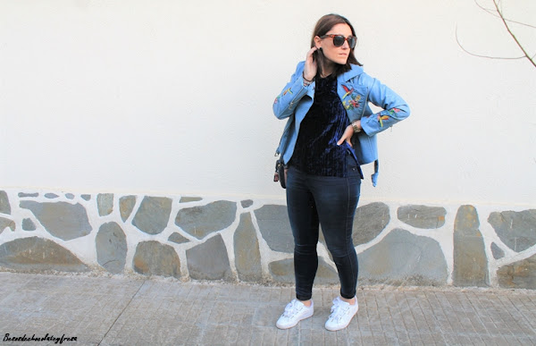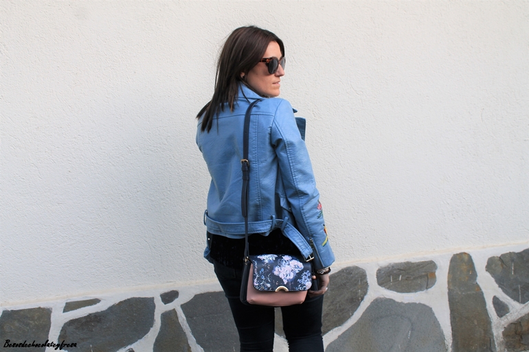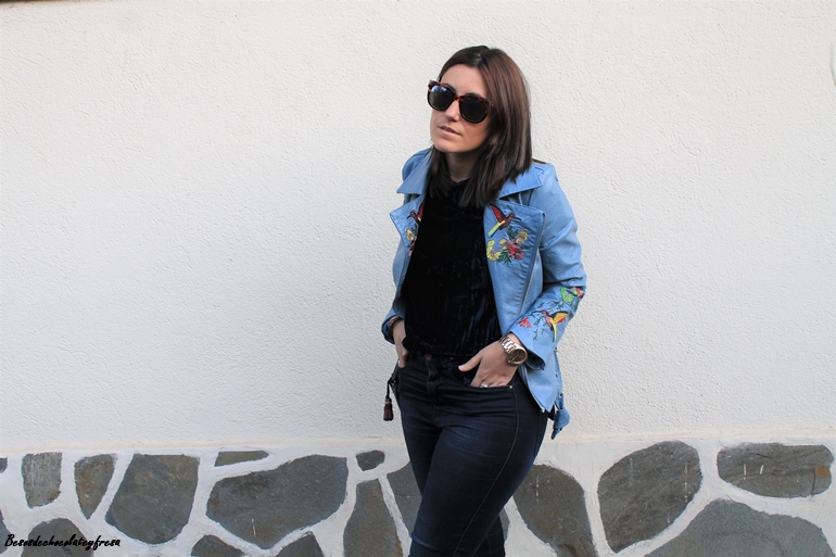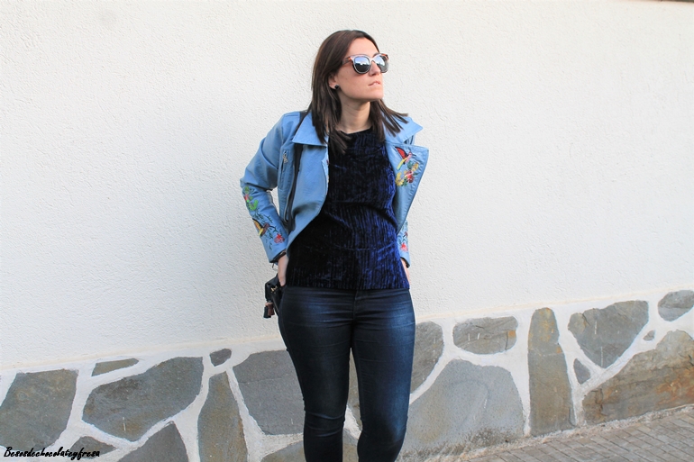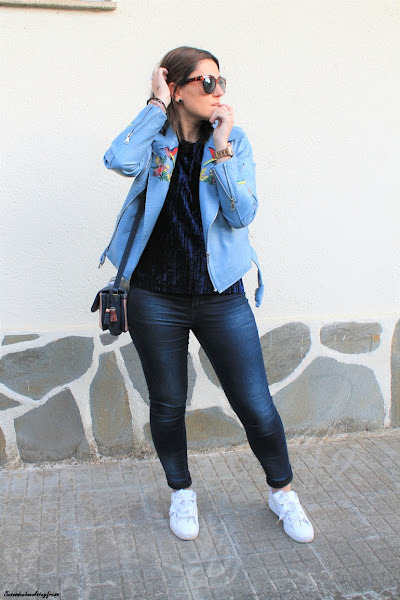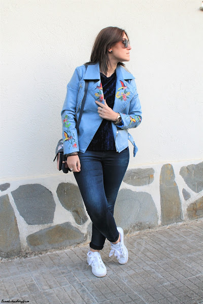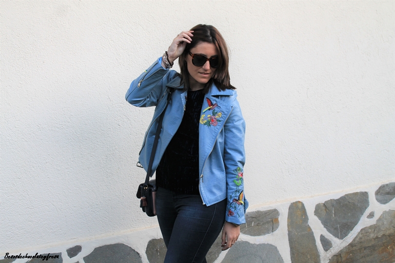 En esta ocasión os muestro una biker que es especial no sólo por su color azul celeste, sino también por sus bordados en las mangas y en las solapas, bordados de flores y animales. La pudisteis ver en este post (AQUÍ). Como dije con una camsieta y unos jeans estaríamos más que perfecta pero le quise dar un extra al look con camiseta de terciopelo en azul marino, ideal, amorosa y calentita.