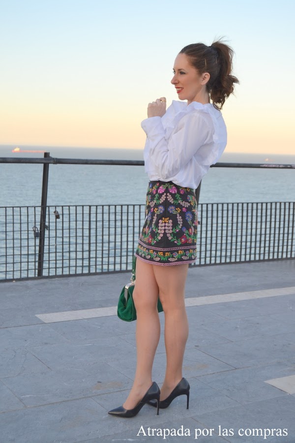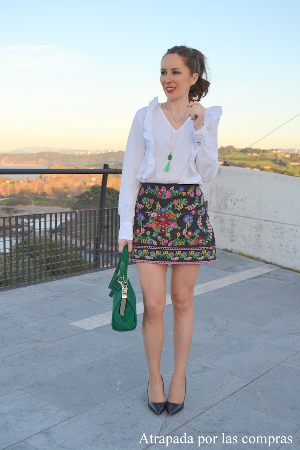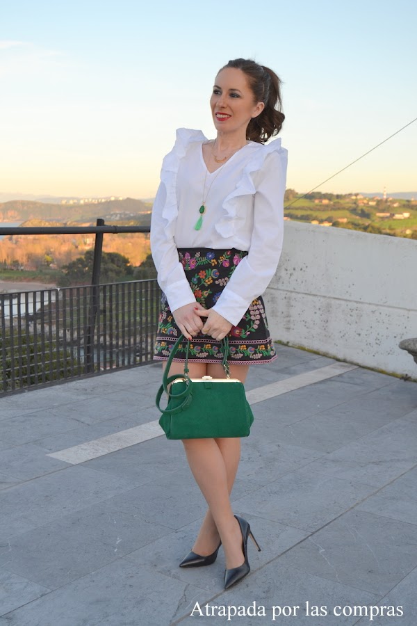 Comenzamos la semana con un look super veraniego en el que las rayas vuelven a estar presentes, en este caso con una blusa de volantes con estampado de rayas y flores y un ligero escote en la espalda. Lo combiné con un short blanco que hace que la blusa gane protagonismo y le añadí color con un bolso verde a juego con las hojas. Soy poco amiga de recogerme el pelo pero considero que a este tipo de ...