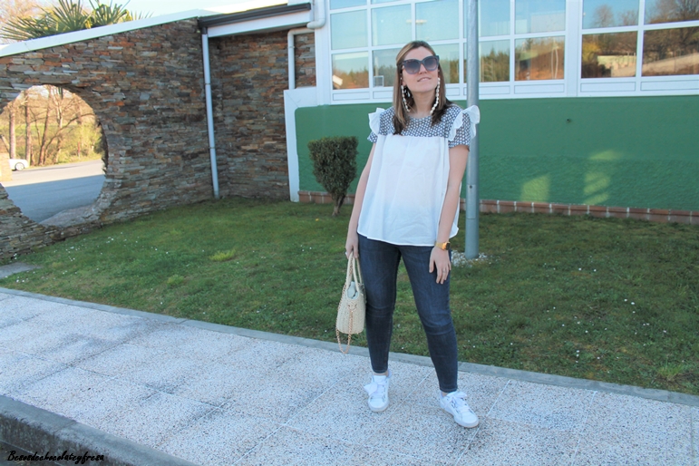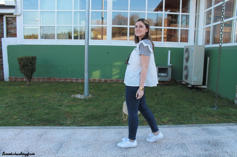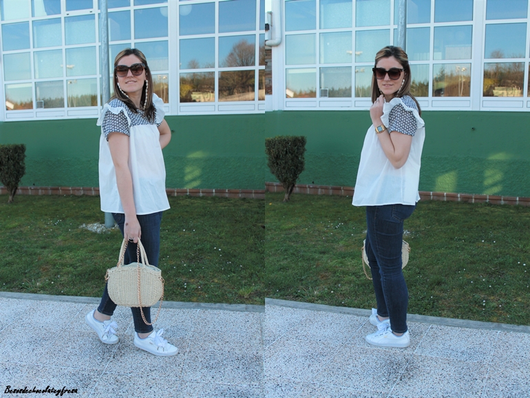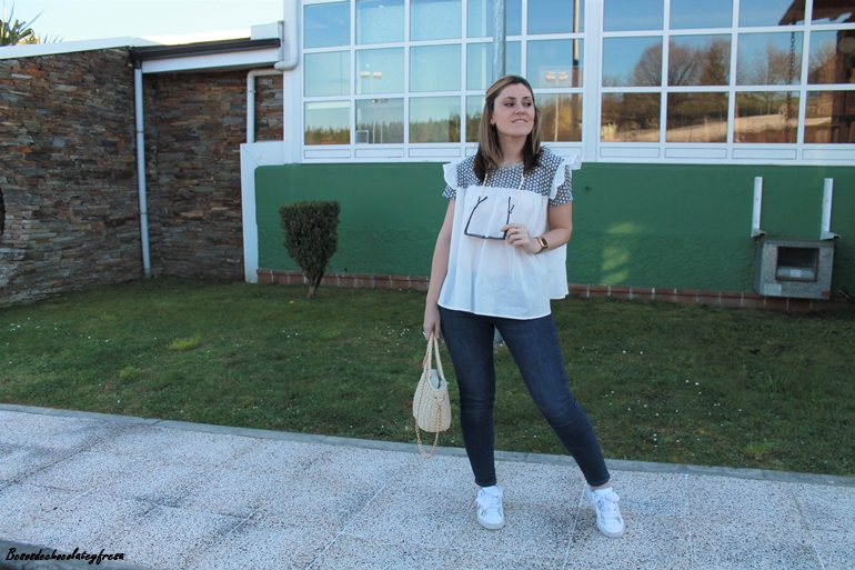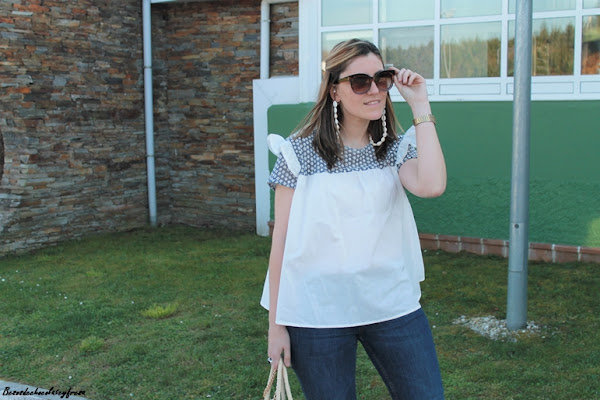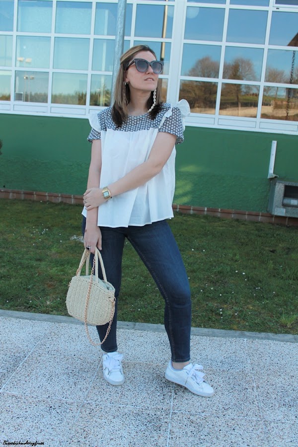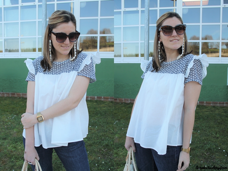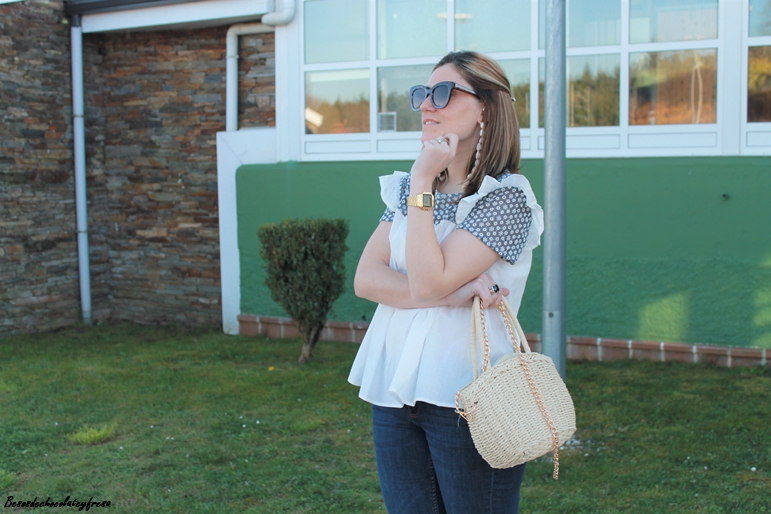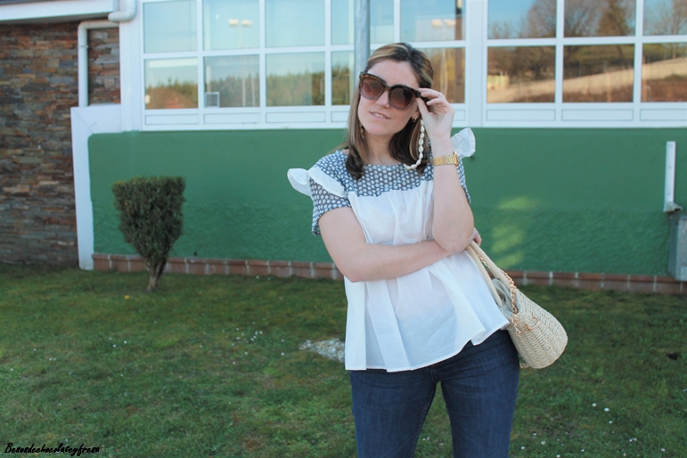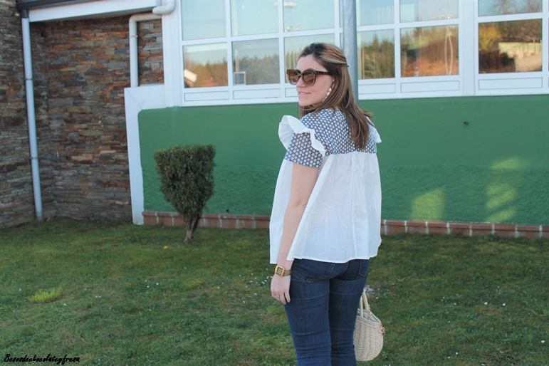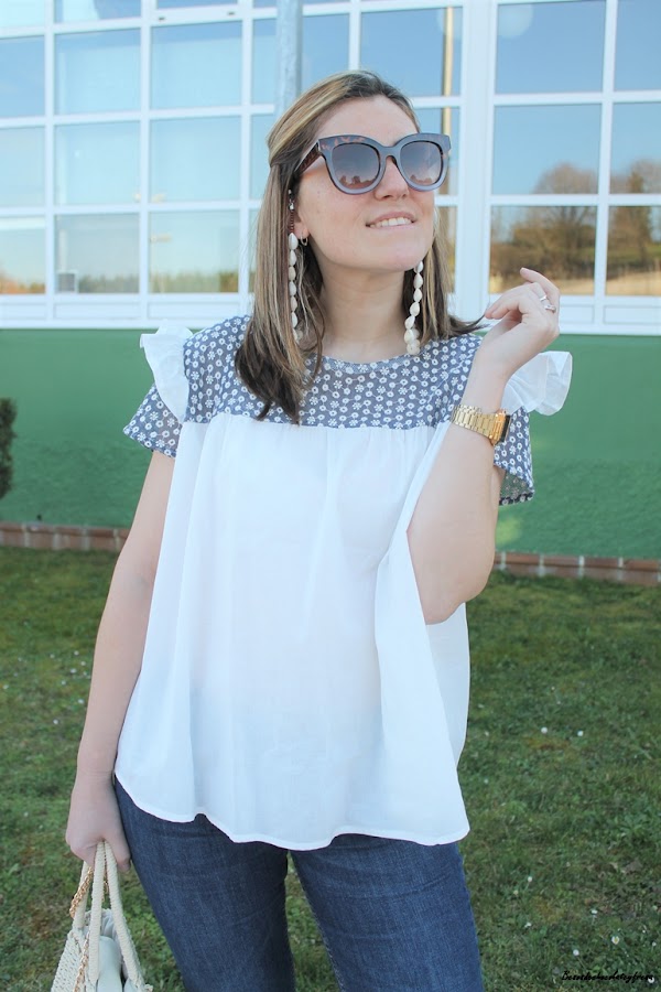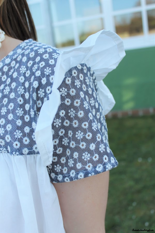 Así es la blusa que os enseño hoy en el look. Holgada con una tela agradable y fresquita para días calurosos con detalle de bordados en flor en la parte superior en color azul y para rematar un ligero volantes en las mangas.