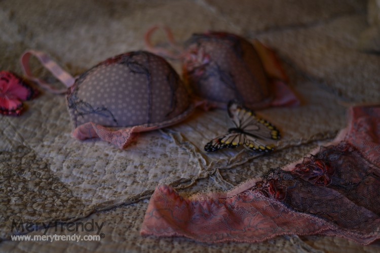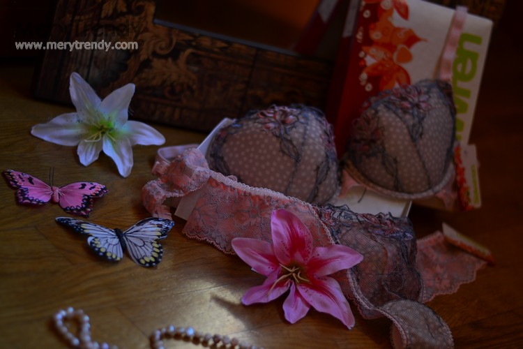Como veis, he escogido un conjunto de encaje, en tonos pastel y con motivos florales; muy femenino, compuesto por atractivo sujetador push-up en color rosa palo con relleno muy suave (que además se puede quitar, al igual que los tirantes), sensuales motivos florales en las copas y sugerente detalle de borla de strass en el centro, entre las copas, a juego con un sexy tanguita de talle bajo con detalle frontal en encaje. ¿Qué os parece?