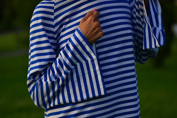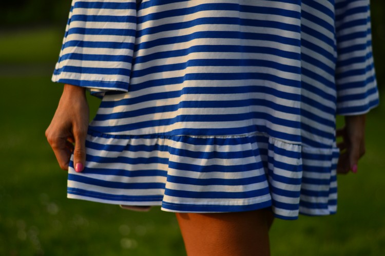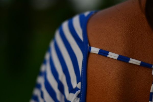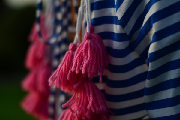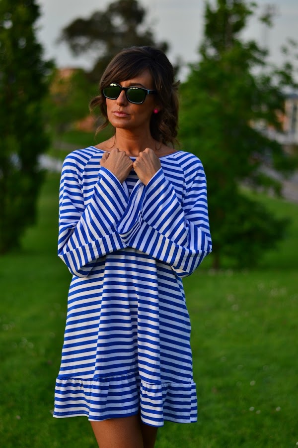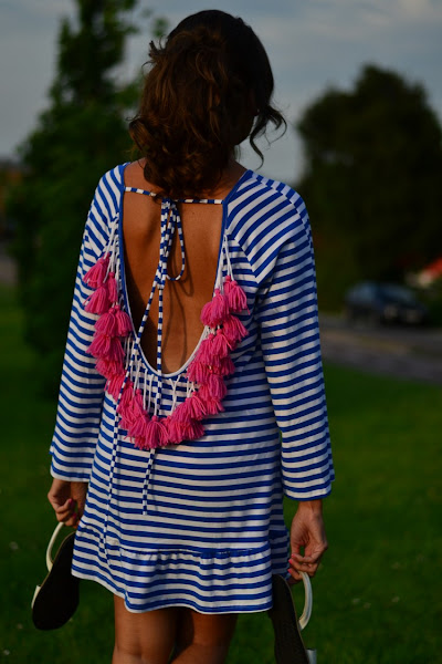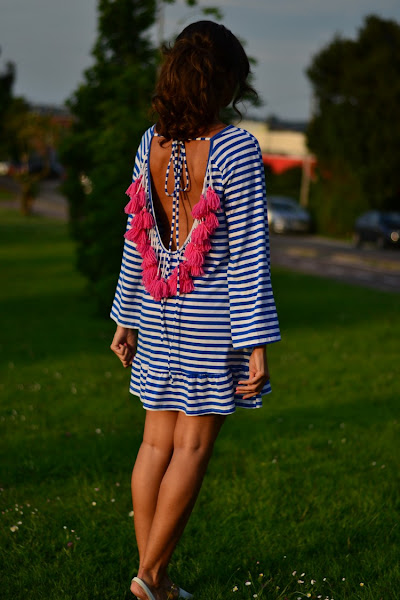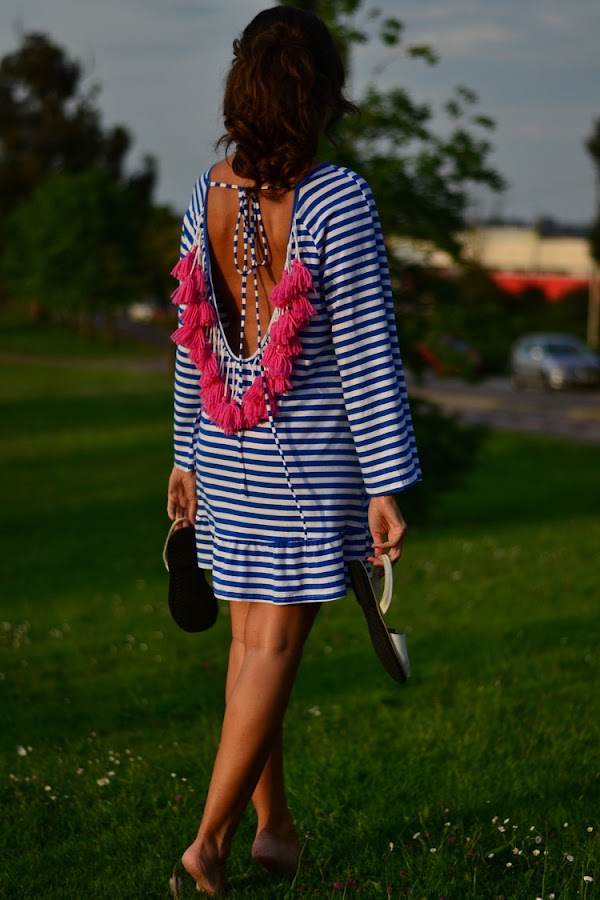 Hoy os enseño el que está llamado a convertirse en otro de los imprescindibles de mi ropero este verano: el mítico caftán, pero reconvertido. Se trata del típico vestidito playero de algodón en color blanco con estampado de rayas en tono azul y cuello redondo, con la particularidad de la manga acampanada y el detalle de las borlas en fucsia alrededor del escote de la espalda que, a mi parecer, le dan un toque muy chulo.