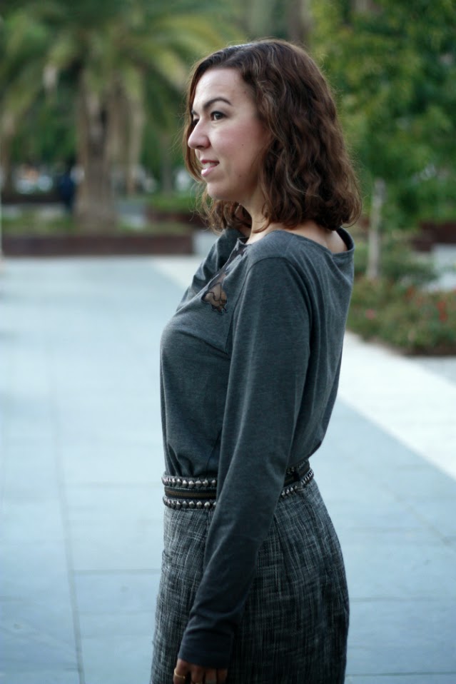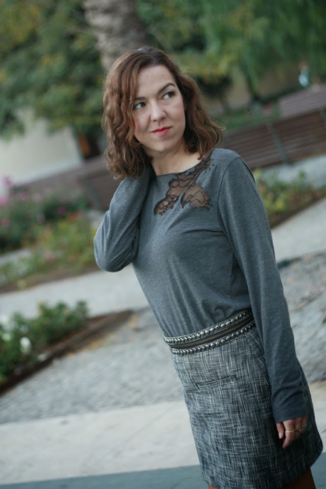 Aparentemente es un estilismo sobrio por el gris predominante y los detalles en negro, pero una vez más, creo que son esos mismos detalles los que dan a este look, ese algo especial: la cintura con tachuelas y cremallera y la transparencia a la altura del hombro.