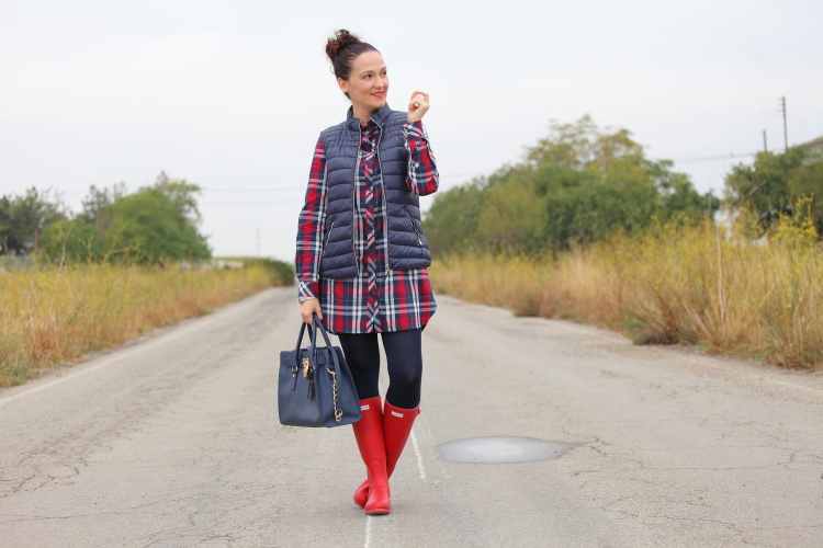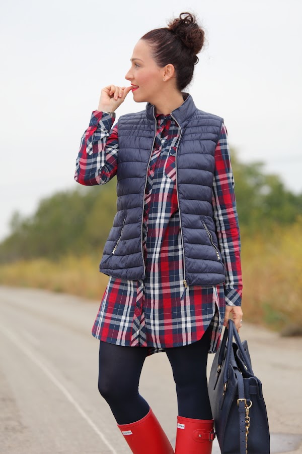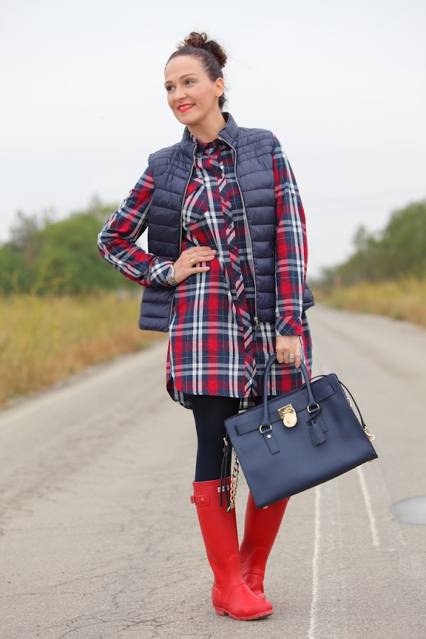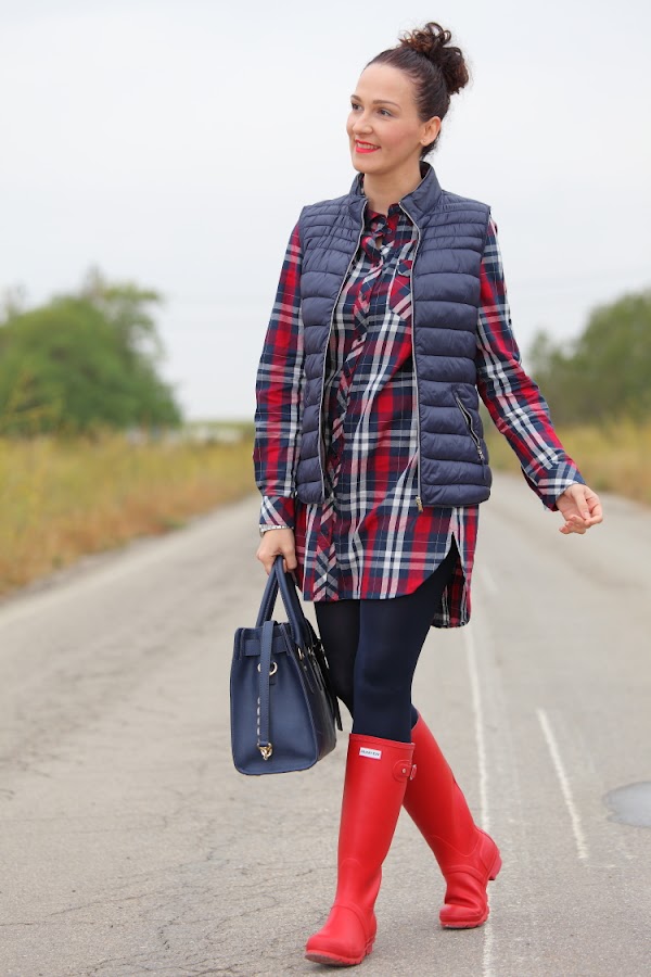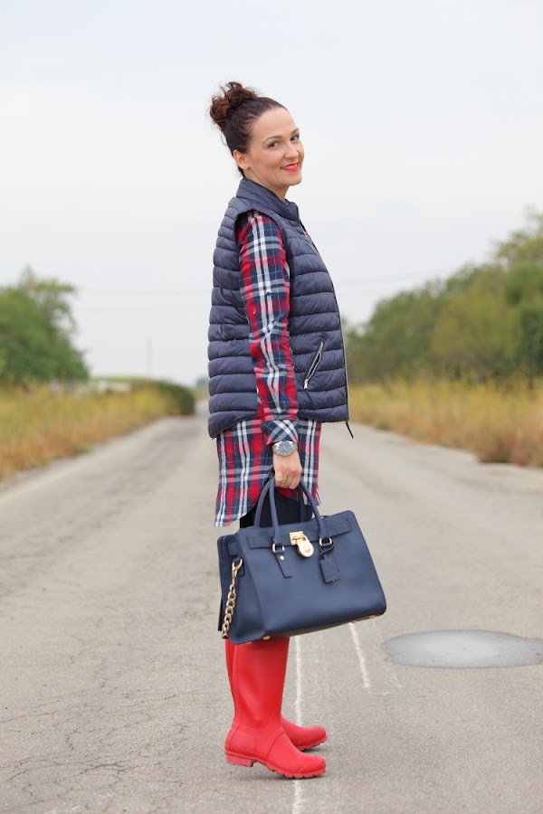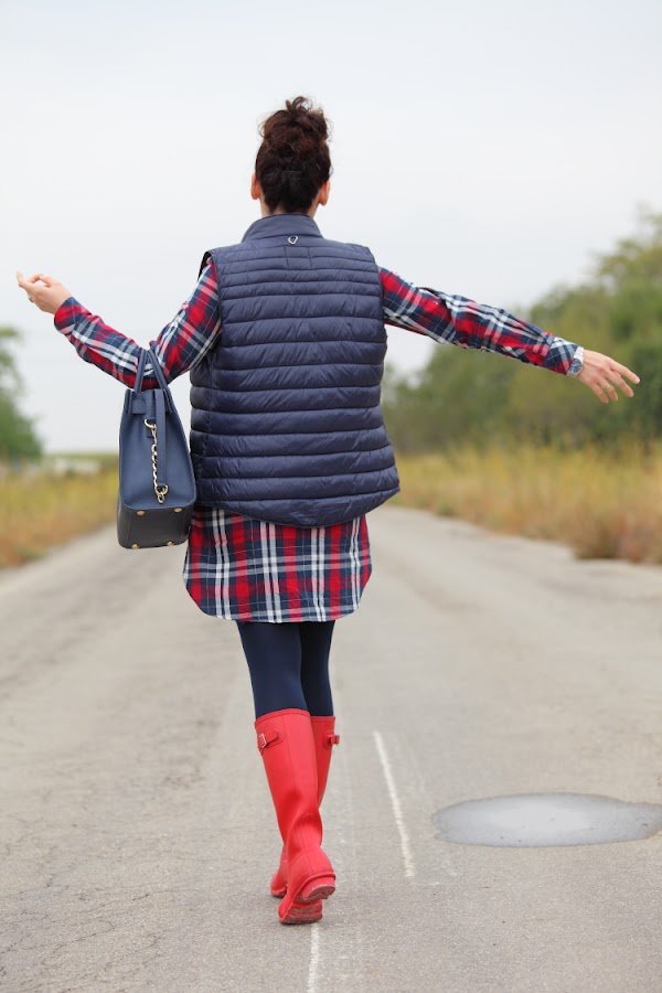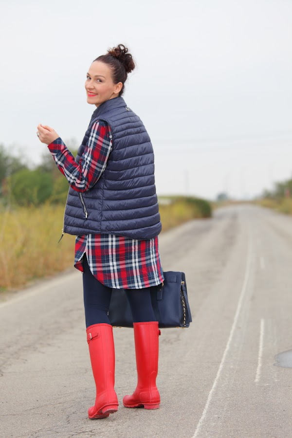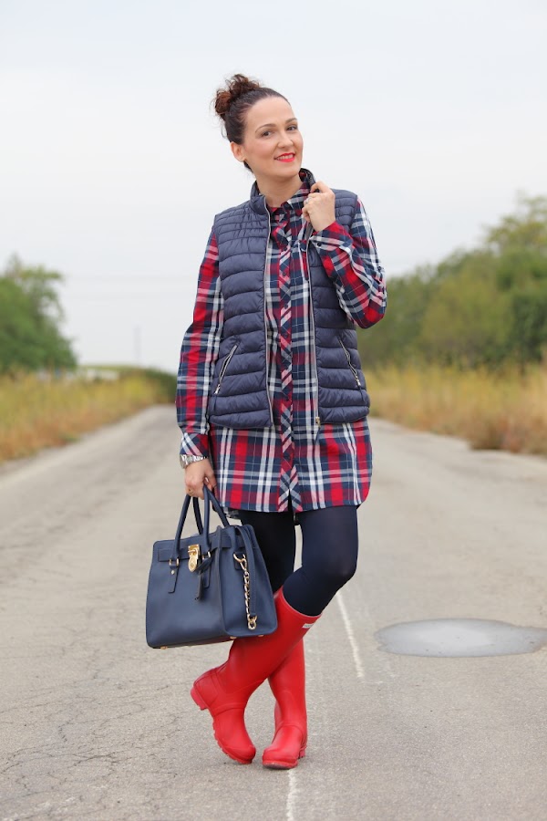 Entre frío, nevadas y lluvias menuda entrada de año estamos teniendo. Así que he pensado que os gustaría que os diera alguna idea de cómo voy vestida estos días. Lo primero que hago siempre es decantarme por la comodidad en el calzado, llevándolo adecuado a la climatología del día, por eso suelo utilizar o botas Hunter como hoy, o mis queridas UGG que son lo mejor para llevar los pies calientes. El resto del outfit lo monto a partir del calzado elegido, este día por ejemplo aproveché para ponerme un vestido camisero de cuadros y chaleco de plumón.