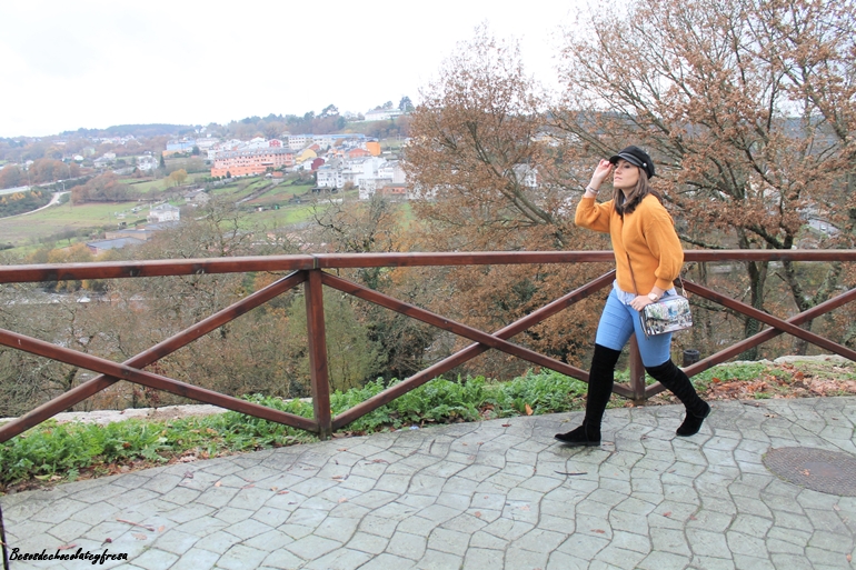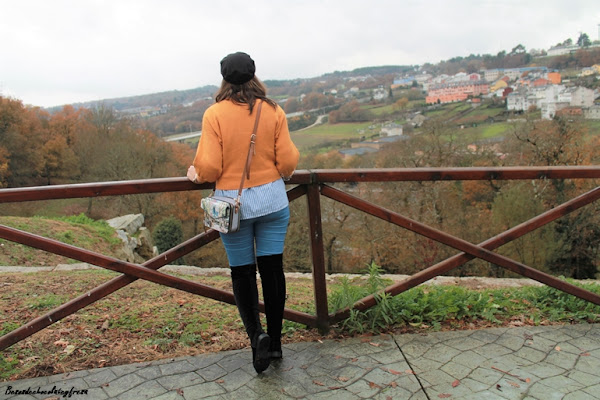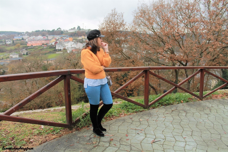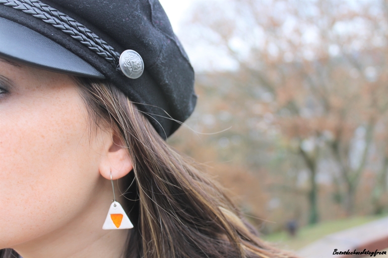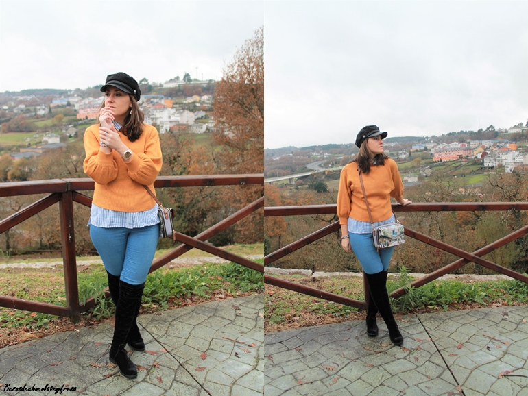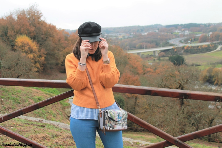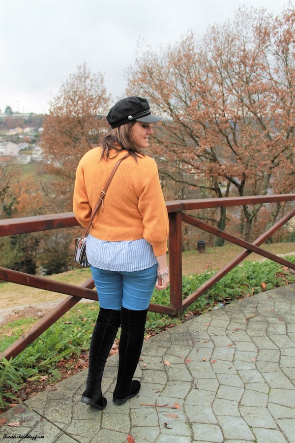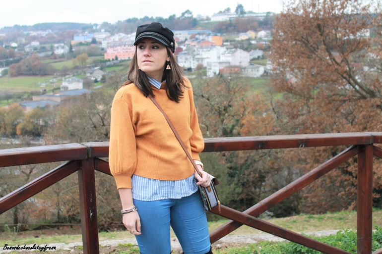 Llevo sweater mostaza, otro de los colores del momento con camisa de rayas en azul celeste por debajo dejando ver el cuello y el bajo de la misma. Bolso de inspiración parisina, gorra marinera y como joyería esta vez aposté por un set de anillos para llevar en multitud de dedos incluso de medio dedo y pendientes regalo de un buen amigo y traidos de Canarias hecho con arcilla y pintados a mano, en los mismos tonos que el look.