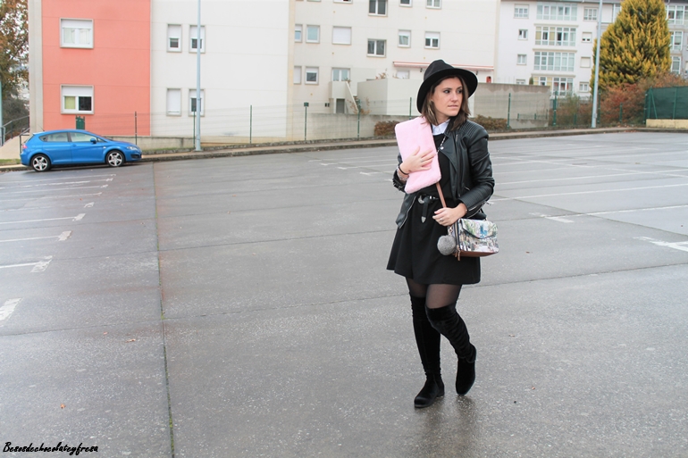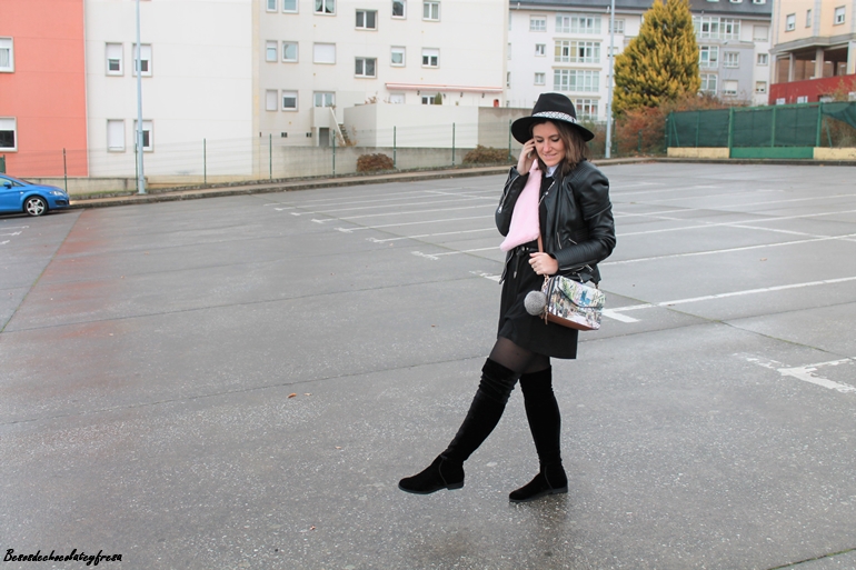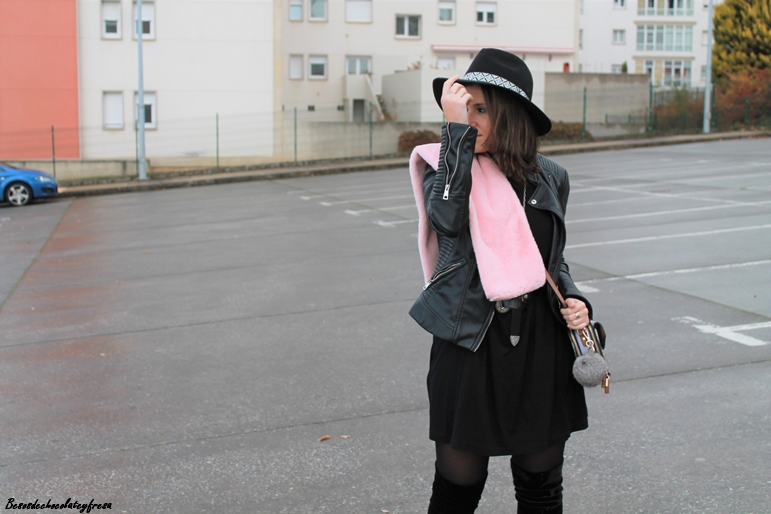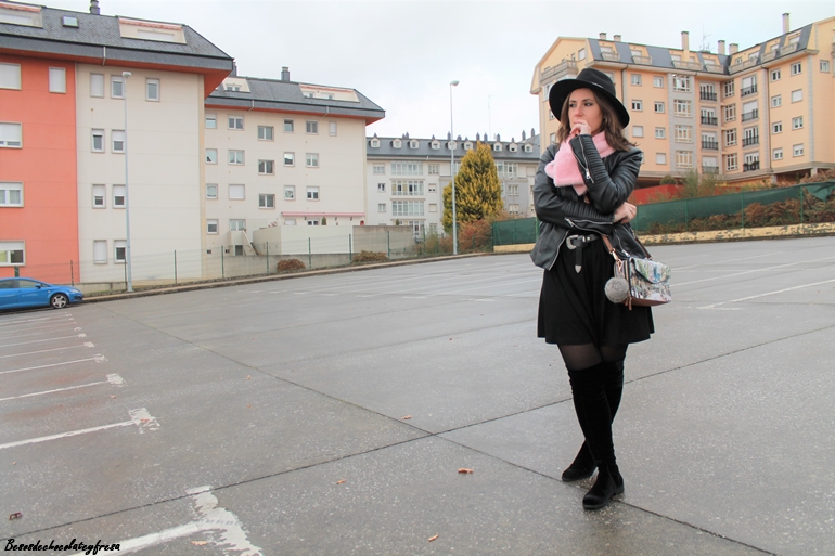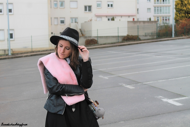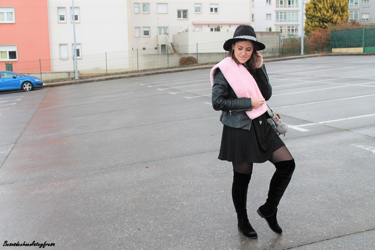 Para el look de hoy decidí apostar por un vestido sencillo en negro, donde le meti por debajo una camisa para que sobresaliese el cuello y le diera un rollo diferente. Cinturón para marcar la cintura, biker negra, sombrero y color en el resto de complementos. El bolso de inspiración Parisina y la estola de color rosa empolvado, amorosa y calentita para llevar al cuello o bien al hombro.
