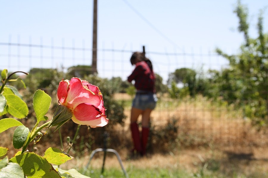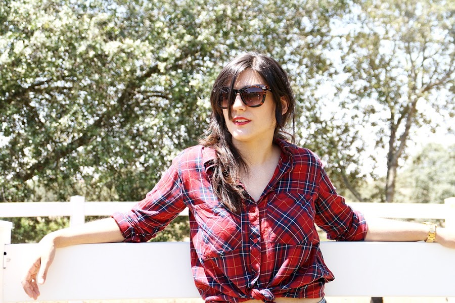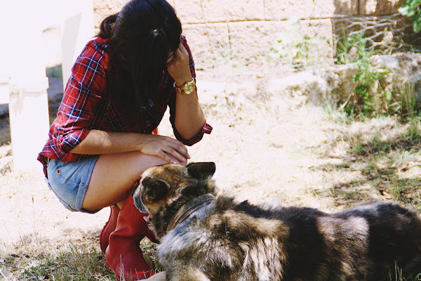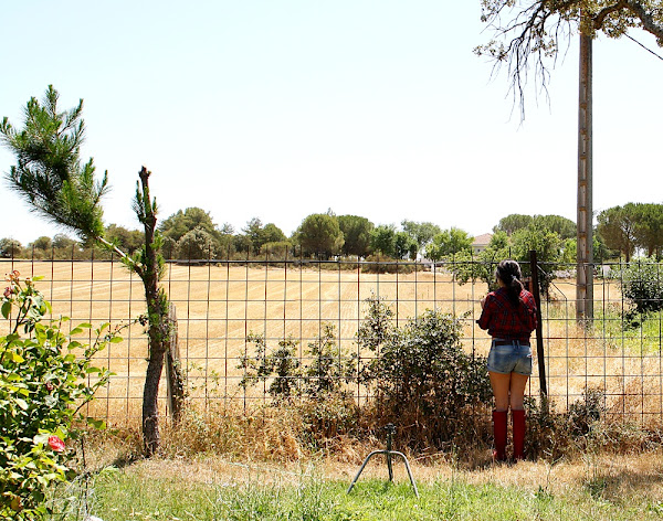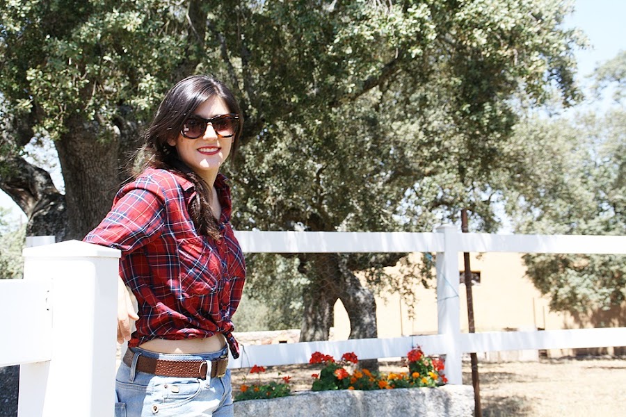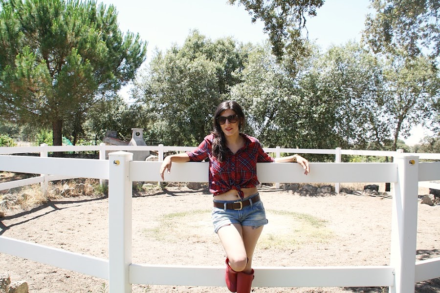 El outfit es bastante simple, porque lo importante es estar fresquito y cómodo (sobre todo lo primero). Se compone de shorts vaqueros, cinturón marrón, camisa a cuadros remangada y botas de goma. Sé que son botas de agua, pero son muy útiles para estas cosas también, ya que en la finca hay barro, paja y... ya sabéis, popó de caballito. En el cabello llevé una coleta (cola de caballo jiji), poque era lo más cómodo con este calor.