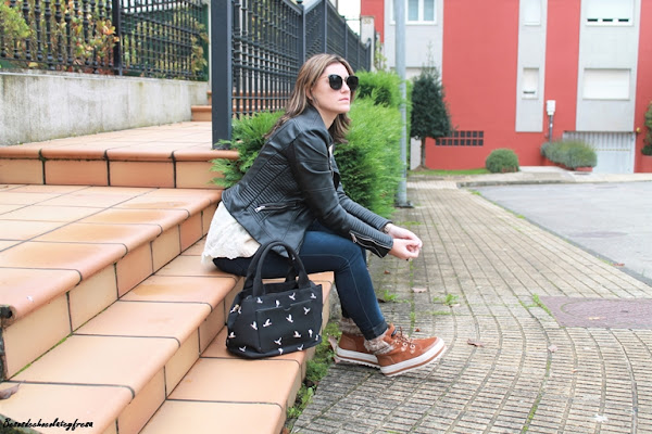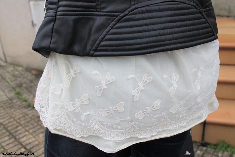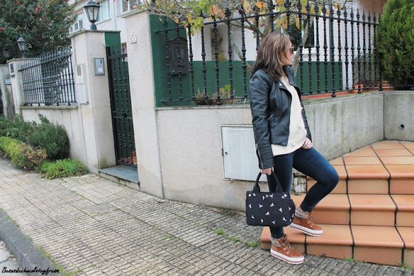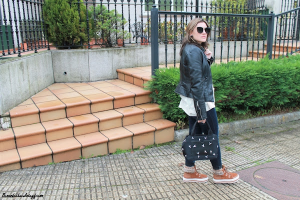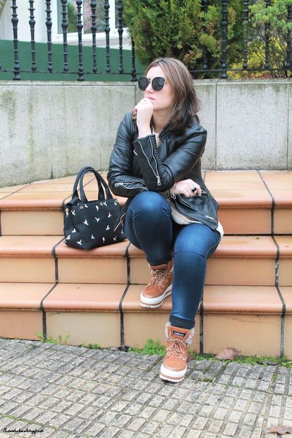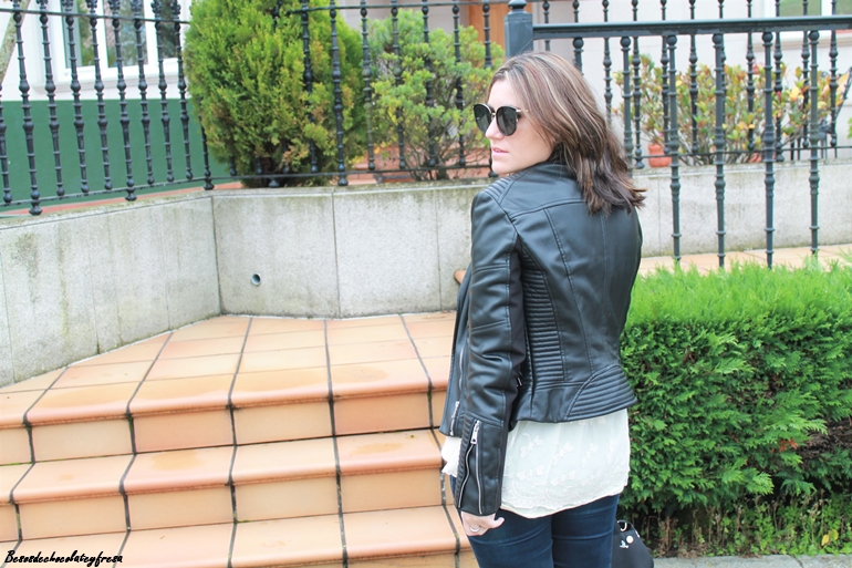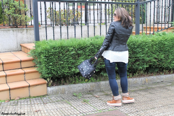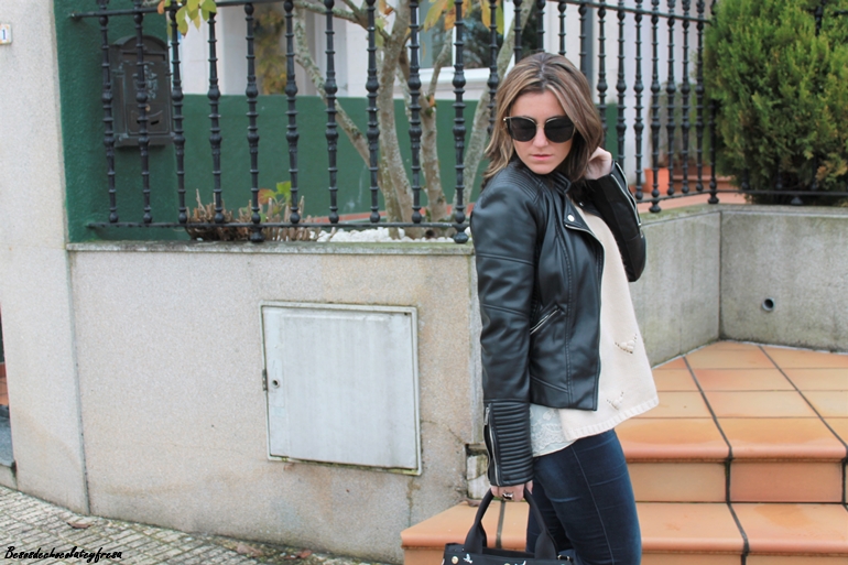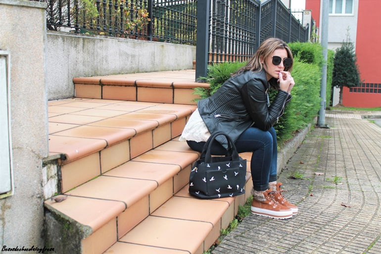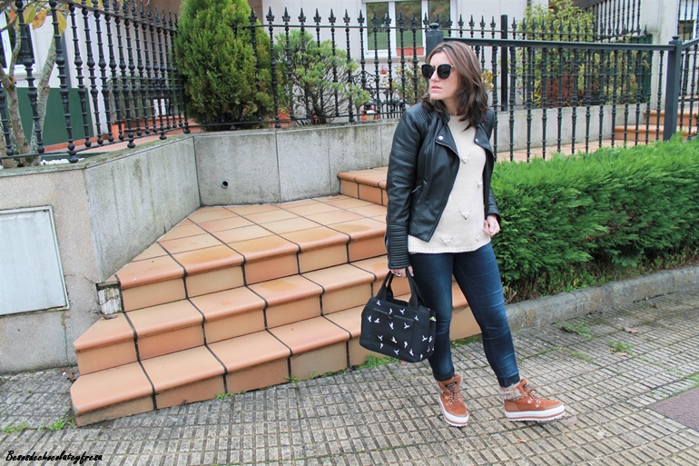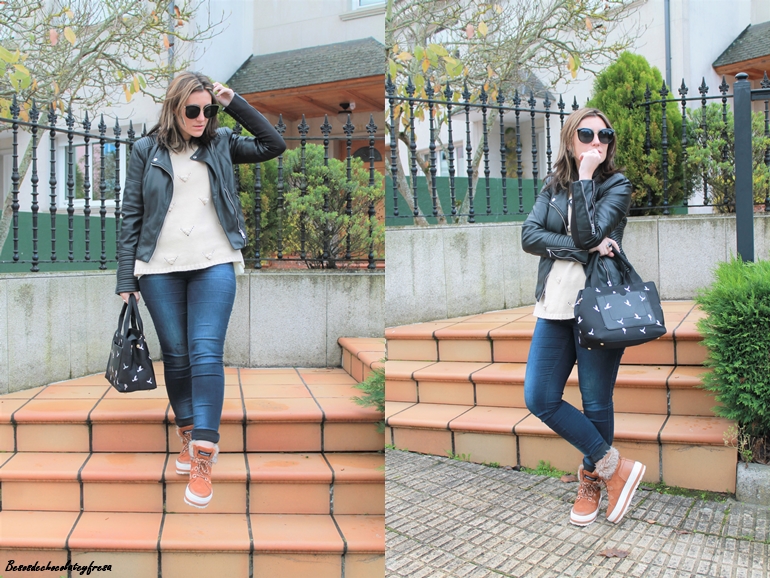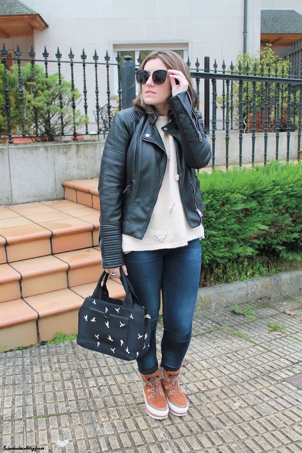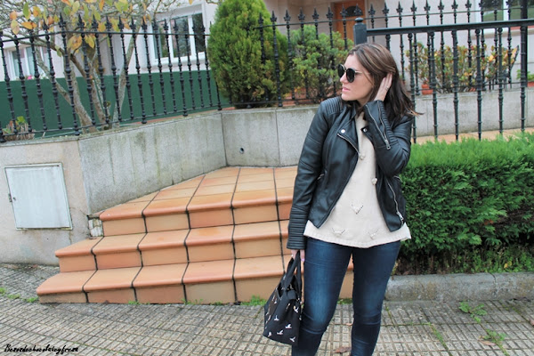 Para esta ocasión decidí combinarlas con colores negro y nude. Para ello llevo sweater en color crema con detalle de borlitas y tul con libélulas en la parte trasera, que me pudisteis ver en este otro post de AQUÍ. Jeans oscuros casi negros, biker y bolso con detalle de palomas en negro.