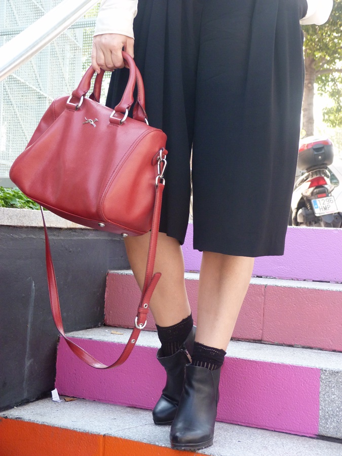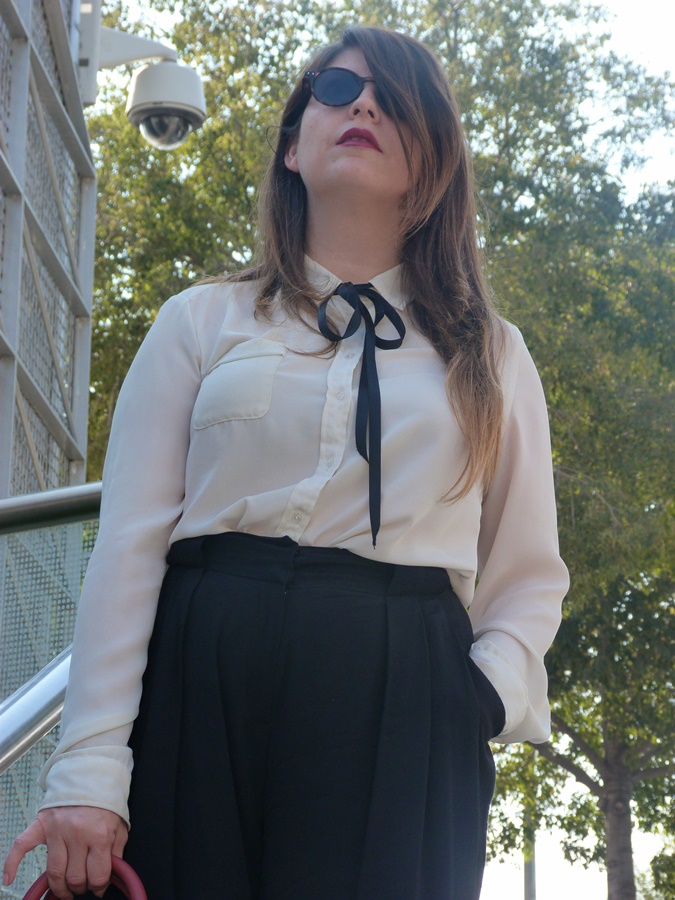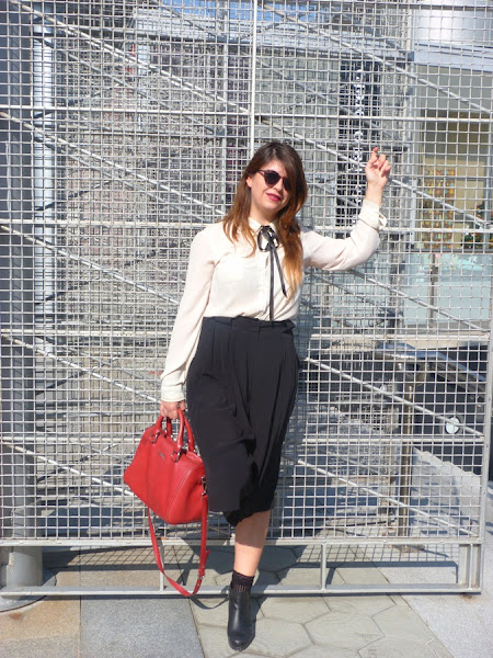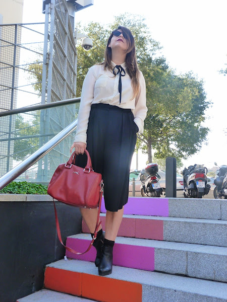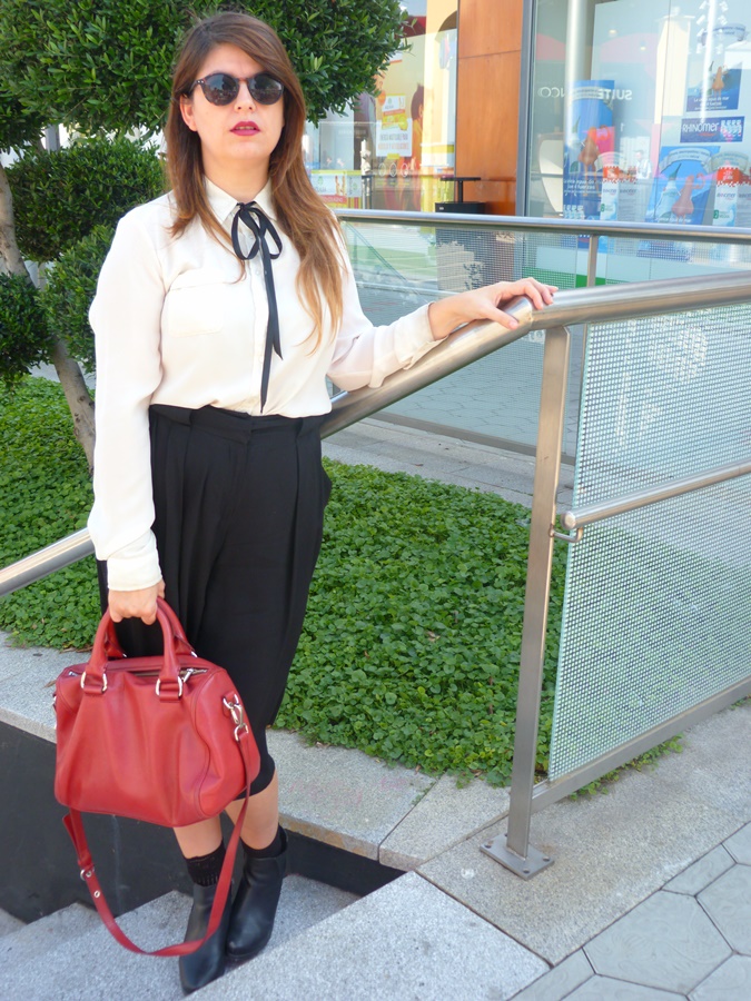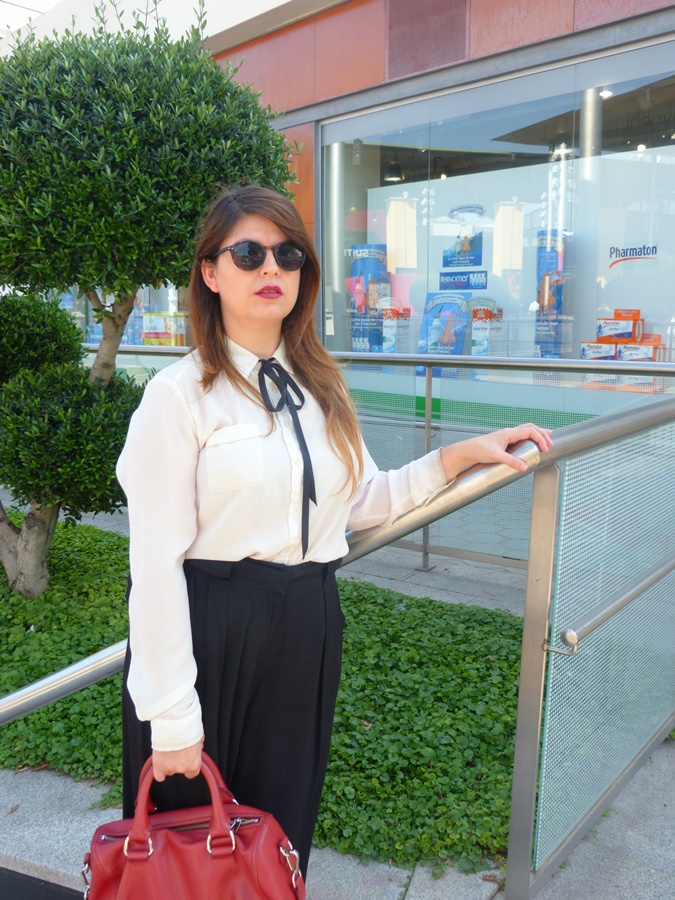 Hoy os traigo un look con una prenda de tendencia de la temporada que yo me he actualizado poniendo un simple lazo de raso a una camisa blanca básica, combinada ésta vez con un pantalón culotte logrando un look black & white que rompo con un bolso rojo de B&L uno de mis favoritos y labios en tono rojizo.