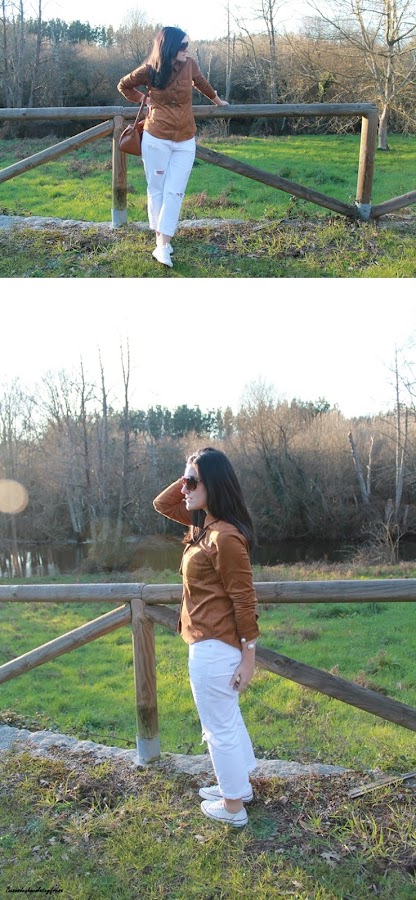 Outfit con sneakers y camisa antelina marrón (AQUÍ)