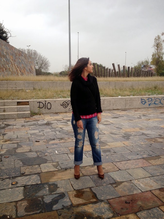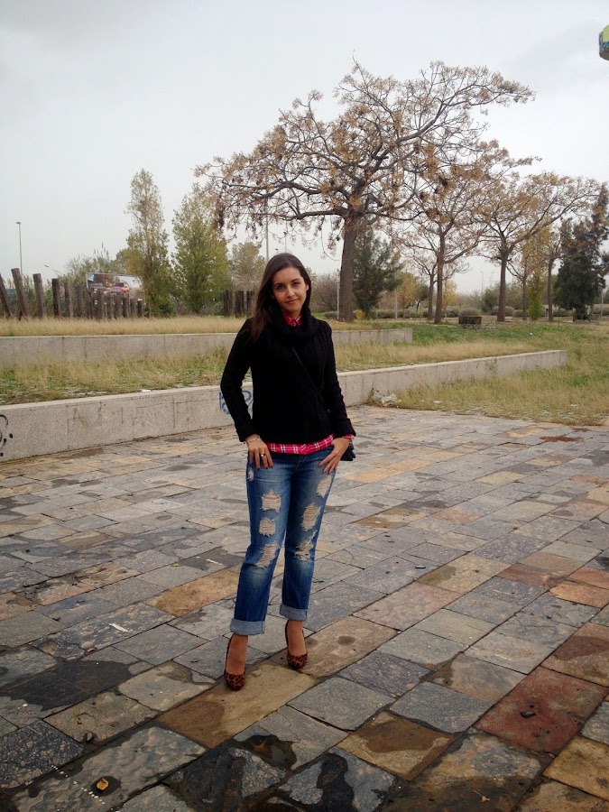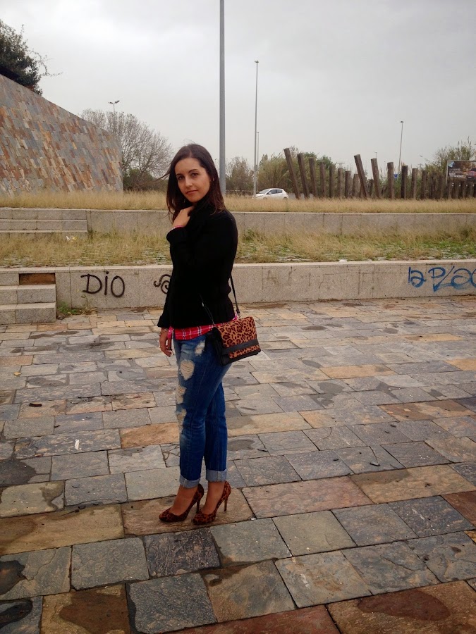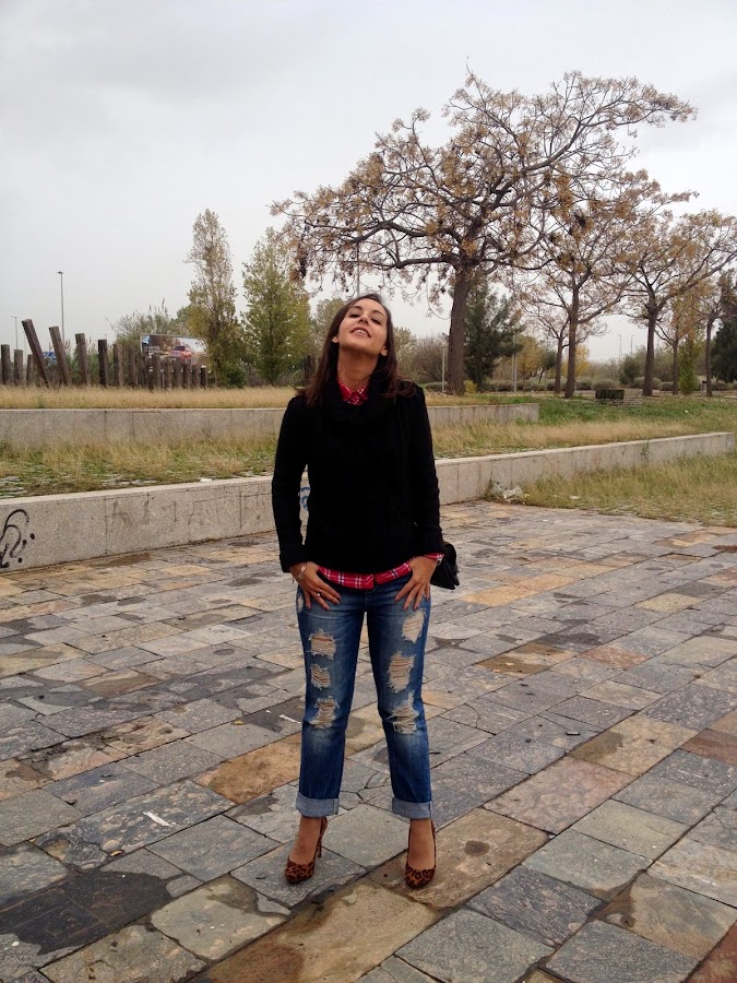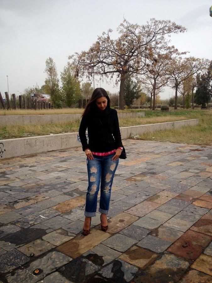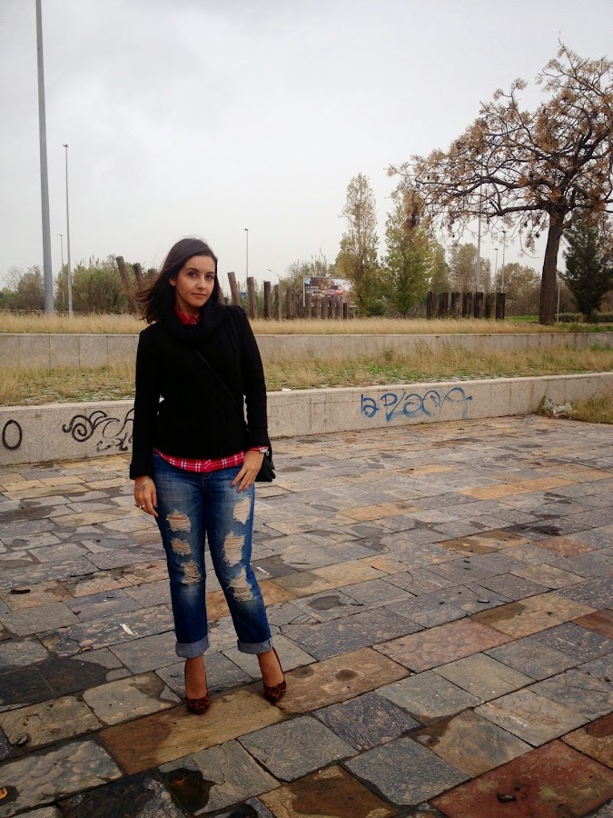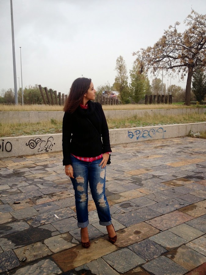 ¿Qué os parece el look de hoy? Gracias por vuestras visitas y comentarios.Good night babies! All the weekend was raining, but the weather give us a truce to take some pictures of the outfit that I show you today. A comfy and warm outfit with boyfriend jeans, tartan shirt and black sweater. To give a chic touch, I wore it with bag and shoes with animal print. I love this mix of animal print and tartan shirts. A mix that it seems impossible, but it mix at the perfection.