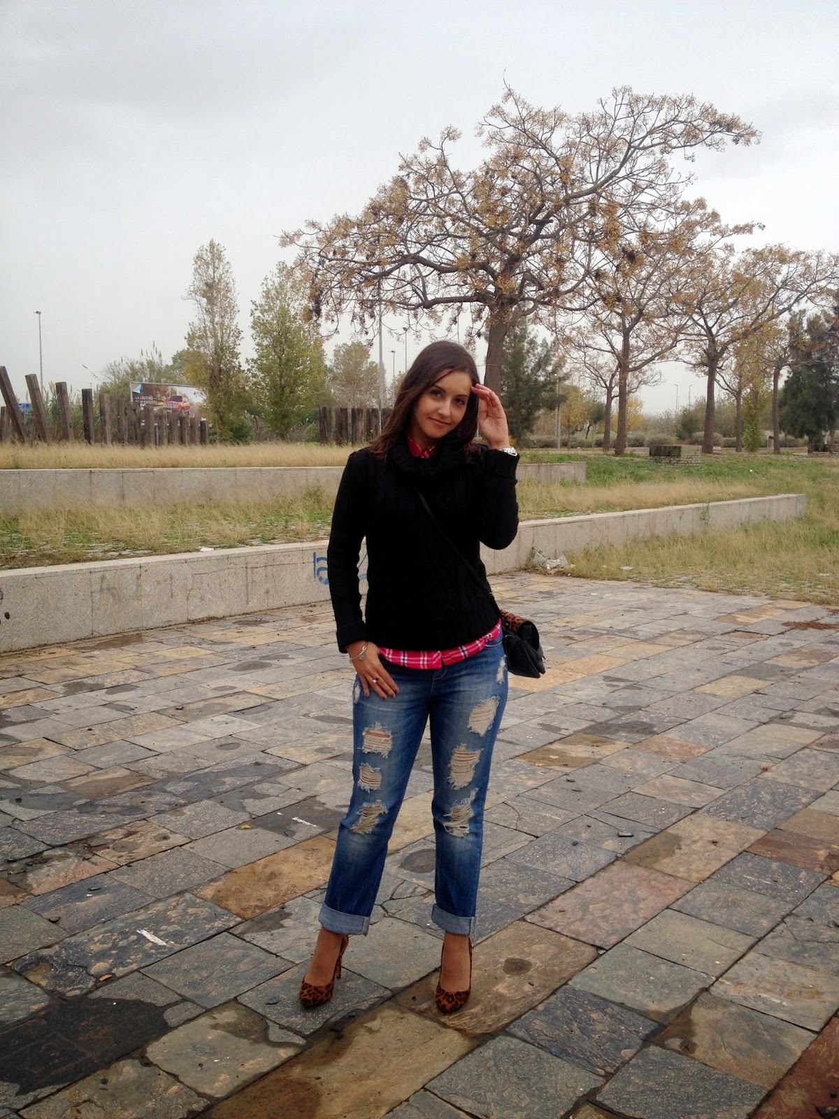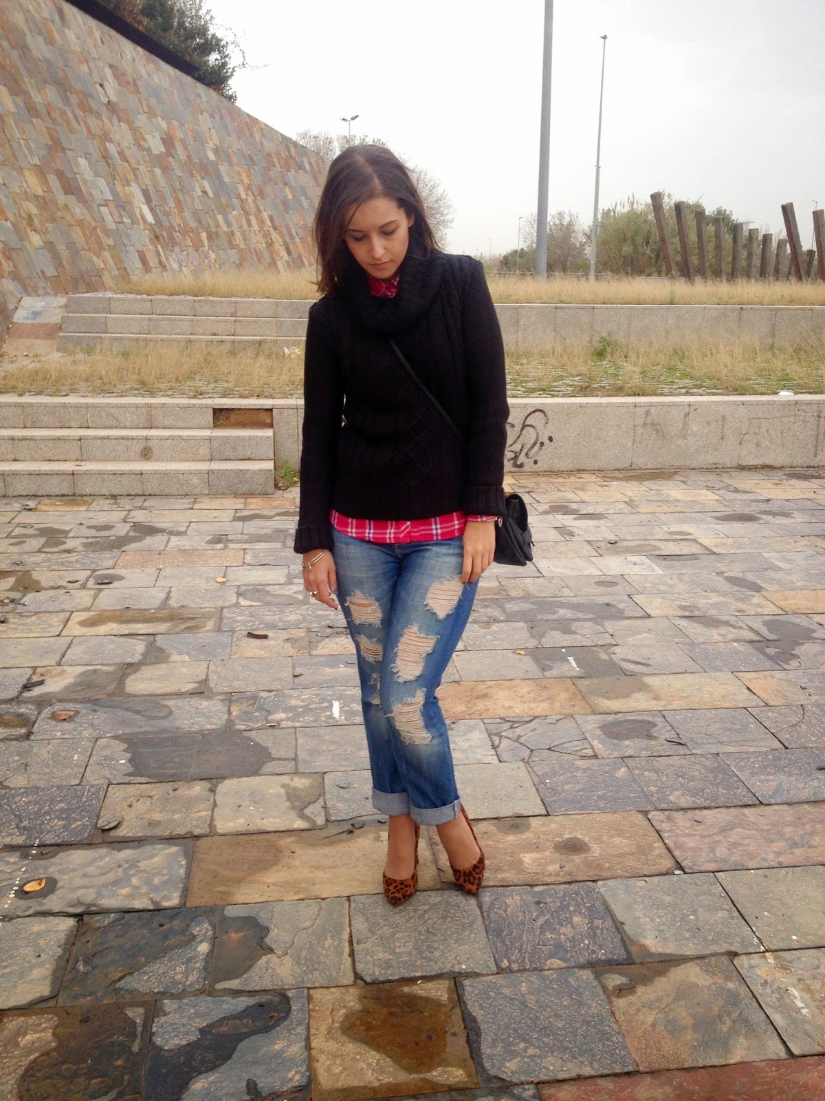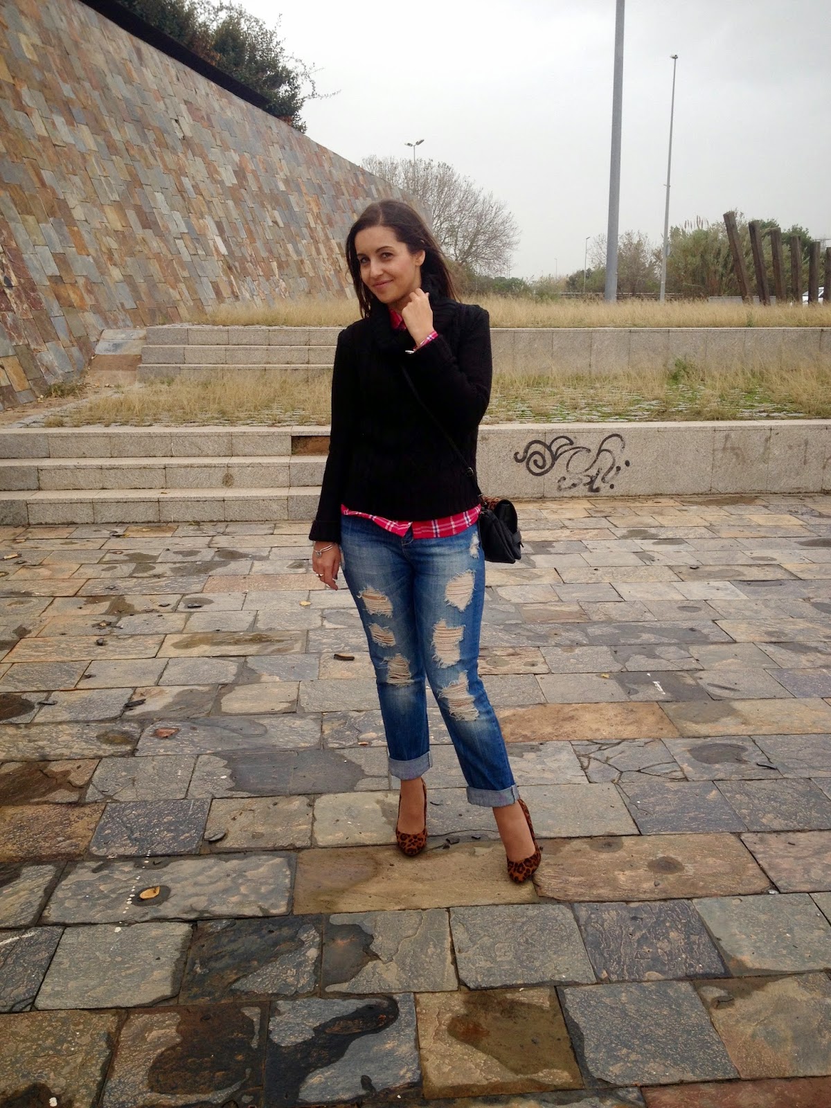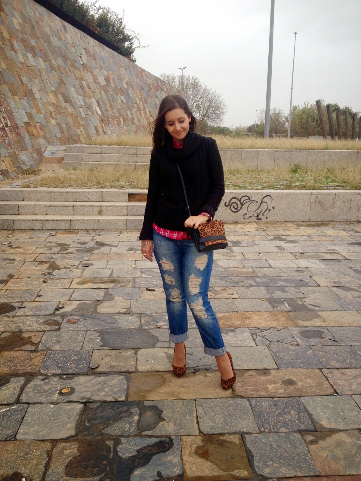 ¿Qué os parece el look de hoy? Gracias por vuestras visitas y comentarios.Good night babies! All the weekend was raining, but the weather give us a truce to take some pictures of the outfit that I show you today. A comfy and warm outfit with boyfriend jeans, tartan shirt and black sweater. To give a chic touch, I wore it with bag and shoes with animal print. I love this mix of animal print and tartan shirts. A mix that it seems impossible, but it mix at the perfection.