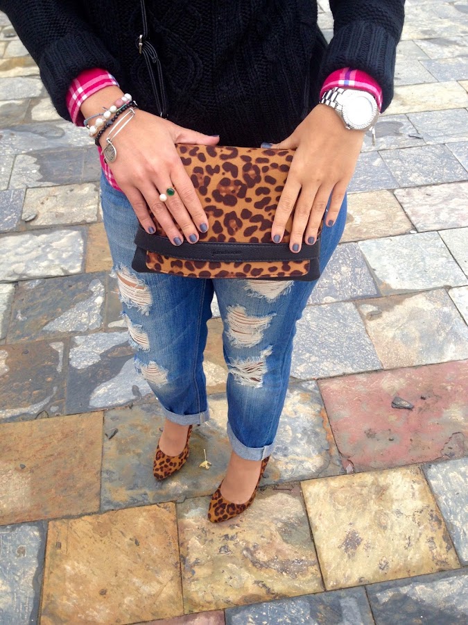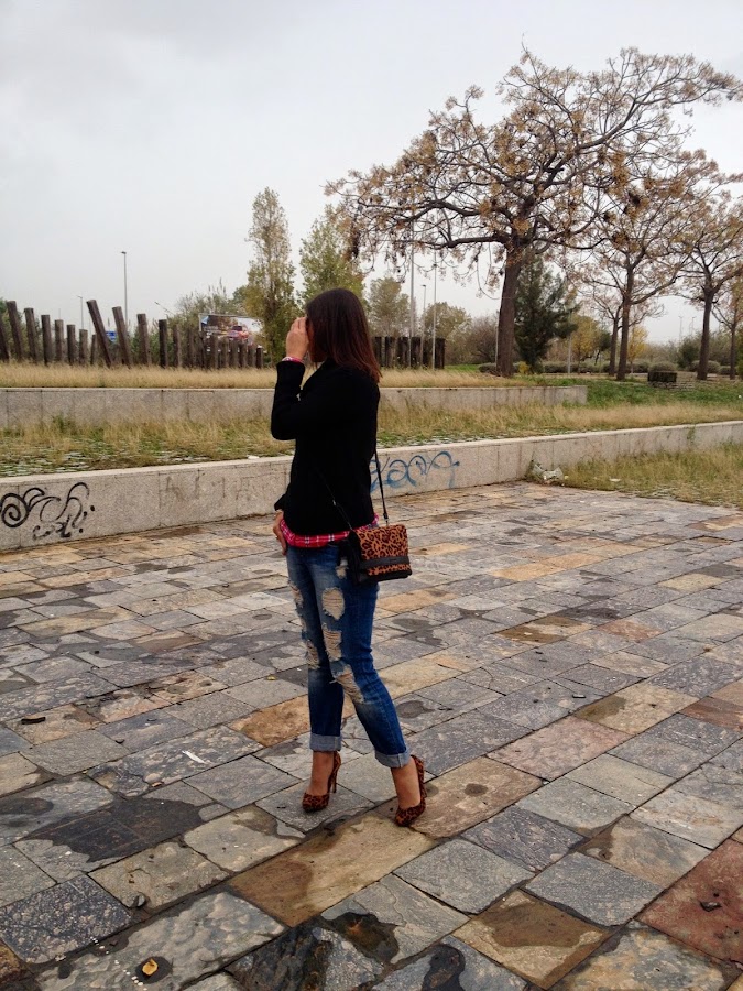 !Buenas noches bombones! Después de un finde pasado por agua, el tiempo nos ha dado una tregua para poder fotografiar el look que os muestro hoy. Un look cómodo y abrigado con mis boyfriend jeans, camisa de cuadros y jersey negro. Para darle un toque chic al look, mi bolso y mis zapatos de animal print. Me encanta la mezcla de animal print con las camisas de cuadros. Un mix que en un principio parece imposible, pero creo que combina a la perfección.